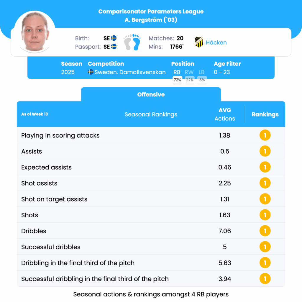 A. Bergström’s standout performance in playing in scoring attacks, assists, shot assists, and dribbling reflects his significant offensive contributions as a Right Back. His ability to influence offensive play through dynamic involvement, precise passing, and effective dribbling positions him as a key asset in aggressive tactical setups. While his goal-scoring and shot accuracy present areas for enhancement, his current strengths suggest a pivotal role in facilitating and executing offensive strategies.
