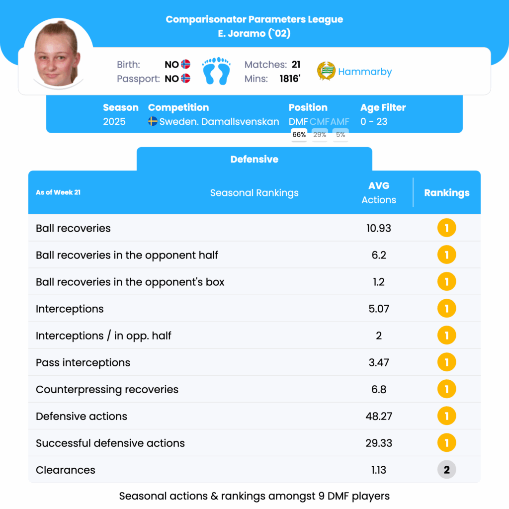 E. Joramo leads with an average of 6.2 ball recoveries in the opponent’s half per match, outperforming J. Fossdalsa, who averaged 5.25. This indicates Joramo’s proactive defensive positioning and ability to disrupt opposition play high up the pitch, essential for initiating counterattacks and maintaining pressure. Joramo tops the rankings with 5.07 interceptions per match, ahead of C. Minas at 4. This highlights Joramo’s excellent reading of the game, positioning, and ability to anticipate passes, making him a crucial player in breaking up opposition attacks and regaining possession. With 6.8 counterpressing recoveries per match, Joramo excels in regaining possession immediately after losing it, showcasing his tenacity and work rate. This skill is vital for teams employing high pressing tactics, as it helps to quickly regain control and disrupt the opponent’s build-up.