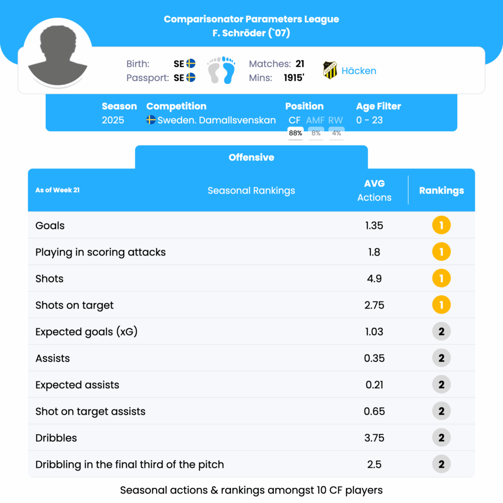 F. Schröder’s performance in the Damallsvenskan 2025 season showcases his strengths in goal scoring, shot volume, and accuracy, making him a vital offensive player. His ability to participate effectively in scoring attacks further underscores his strategic importance in offensive build-up play. However, areas such as dribbling success and shot conversion rate present opportunities for development, which, if addressed, could significantly enhance his overall impact on the field.