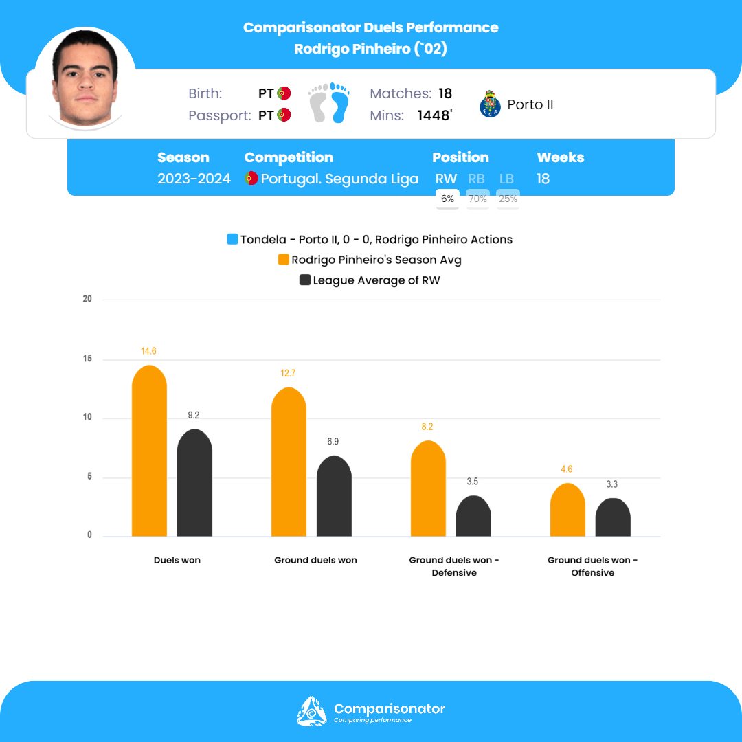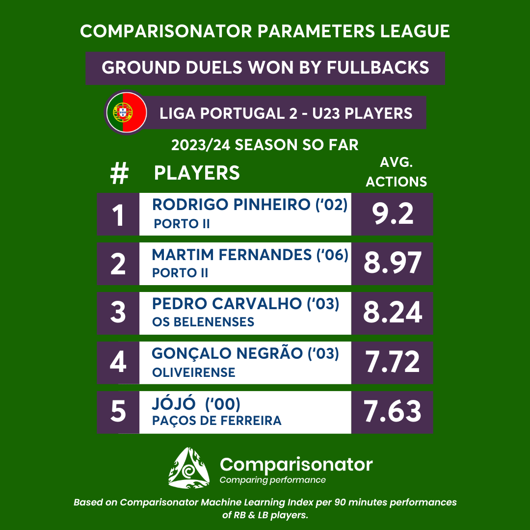 Defensive solidity is crucial, and Rodrigo Pinheiro leads U23 fullbacks with an impressive average of 9.2 ground duels won per 90 minutes. Martim Fernandes, Pedro Carvalho, Gonçalo Negrao, and Jojo showcase their defensive prowess, ensuring resilience and stability at the back.
