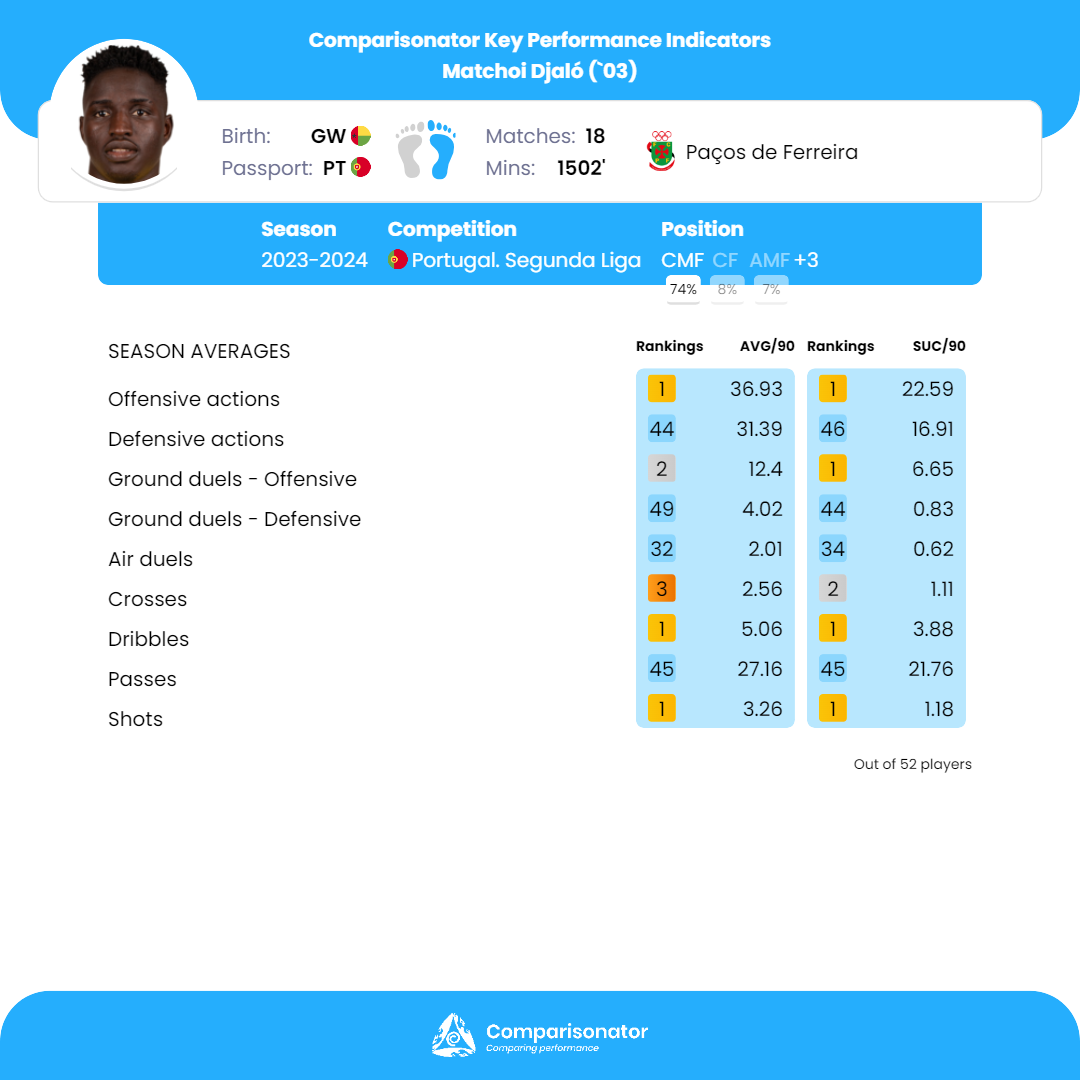 Within the Liga Portugal 2, Comparisonator platform identifies exceptional U23 talents across various parameters, showcasing their prowess and impact on the league. From midfield maestros creating scoring opportunities to fullbacks asserting dominance in defensive duels, these players are instrumental in shaping the competitive landscape of Portuguese football. This analysis delves into the top performers, highlighting their contributions and influence within Liga Portugal 2.