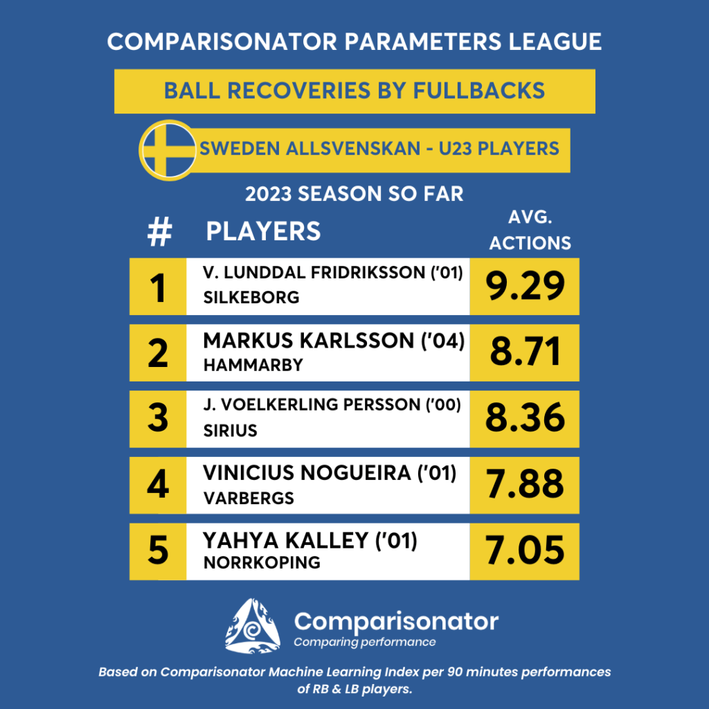 In terms of defensive contributions, Valgeir Lunddal Fridriksson leads U23 fullbacks with an average of 9.29 ball recoveries per 90 minutes. Markus Karlsson, Jakob Voelkerling Persson, Vinicius Nogueira, and Yahya Kalley also stand out, highlighting their defensive diligence and ability to regain possession.