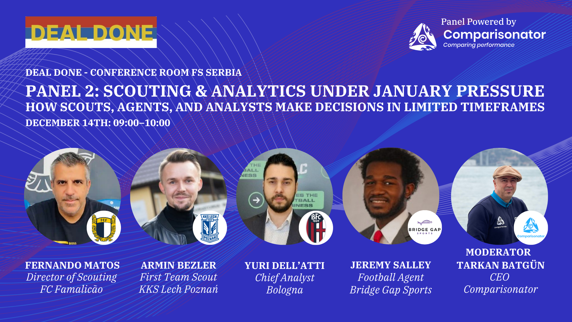 Comparisonator is proud to host a high-impact panel at Deal Done Serbia focused on βScouting & Analytics Under January Pressureβ, exploring how scouts, agents, and analysts make critical decisions within limited timeframes. As one of Europeβs fastest-growing football business summits, Deal Done Serbia brings together key decision-makers from across the industry. This session will dive into the realities of the winter transfer window, where time constraints, incomplete information, and strategic risk demand faster, smarter, and more data-driven judgment. A must-attend discussion for professionals working in scouting, recruitment, analytics, and football operations who want to understand how decisions are truly made when pressure is at its highest.