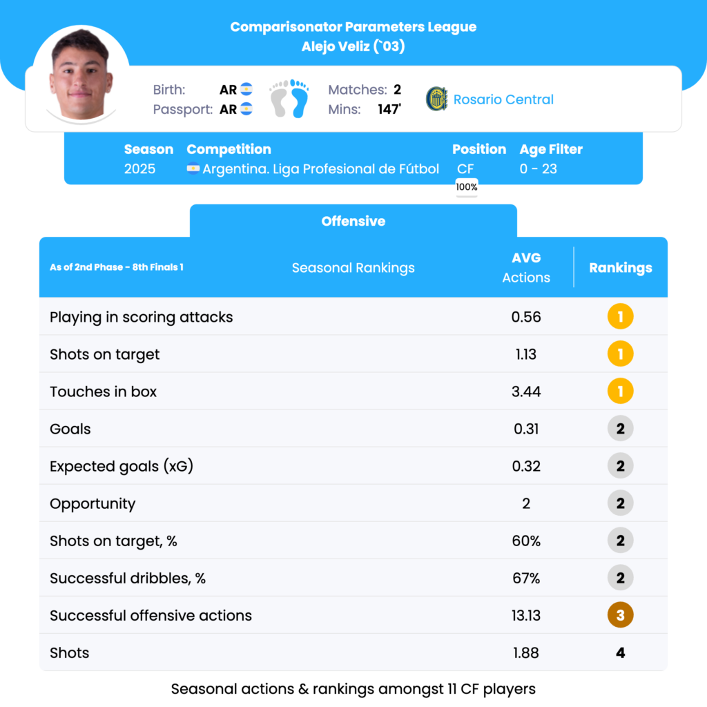 Alejo Veliz’s strongest seasonal parameters are Playing in scoring attacks (1st), Shots on target (1st), Touches in the box (1st), Goals per match (2nd), and xG per match (2nd). These rankings underline a striker profile centered on box presence, shot selection, and consistent involvement in high-quality attacking moments. His limitations appear in creative output, ball progression, and high-volume involvement, suggesting he can be most effective as a central reference in possession-dominant or structured attacking systems, rather than as a mobile, creative, or transition-led forward.