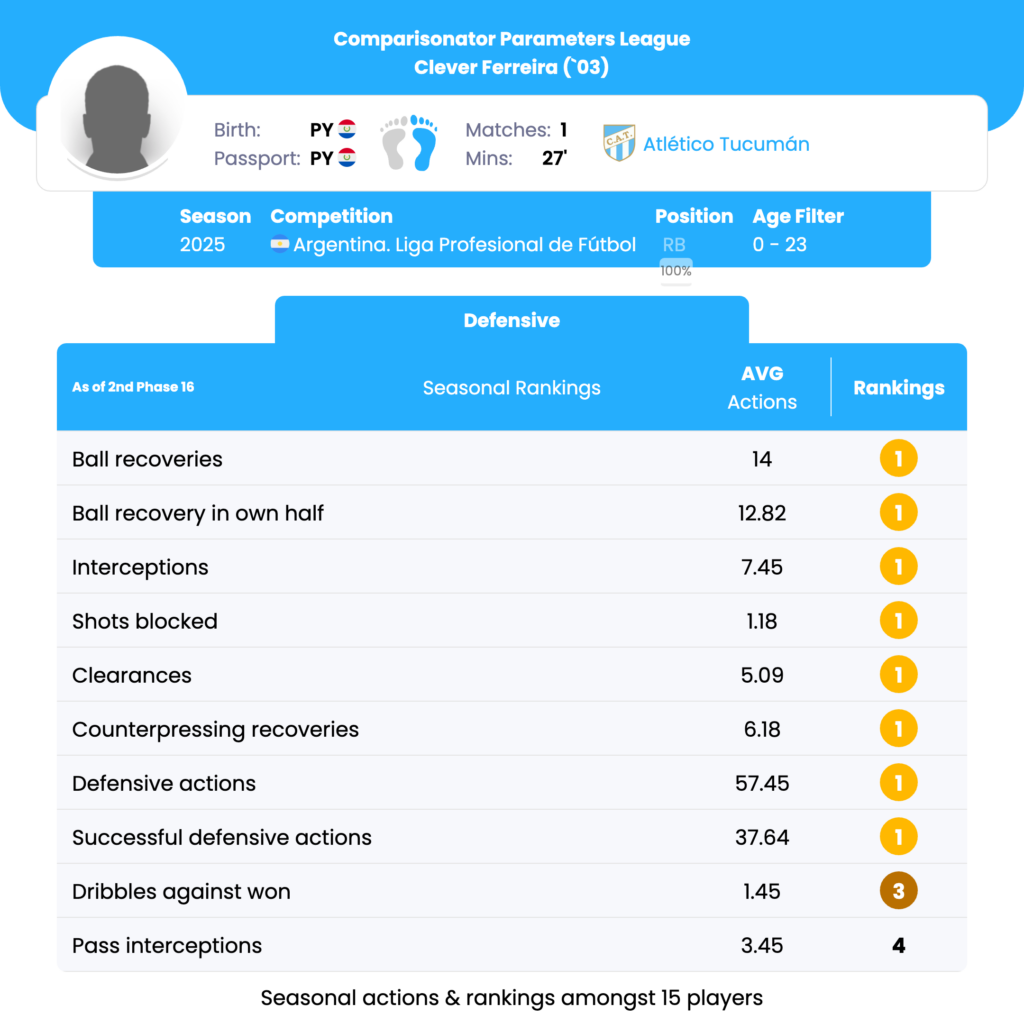 Clever Ferreira’s seasonal profile highlights elite rankings in defensive actions, ball recoveries, interceptions, counterpressing recoveries, clearances, and shots blocked, consistently placing him 1st among U23 right backs in the league. His strengths point toward a defensively dominant, reactive full-back who excels in deep and mid-block structures. Tactically, he can be deployed in systems prioritizing defensive solidity on the flank, controlled pressing triggers, and protection of the defensive third. Usage in high-possession or aggressive high-press models may require structural support to manage ball losses and reduce exposure in advanced zones.