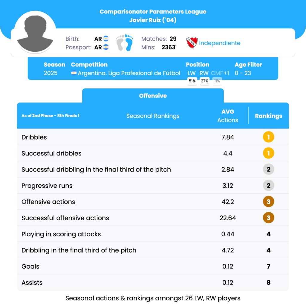Javier Ruiz’s strongest seasonal parameters are clearly dribbles, successful dribbles, progressive runs, final third ball carrying, and overall offensive involvement, where he consistently ranks in the top 1–4 among U23 wide players. These metrics define him as a high-volume, high-impact winger whose primary value lies in ball progression, 1v1 dominance, and destabilizing defensive structures. From a tactical usage perspective, Ruiz may be best deployed as a touchline winger or wide progression outlet, especially in systems that prioritize isolation, transitions, and territorial gain. His profile can complement more goal-oriented forwards or inverted attackers, while reduced emphasis on finishing responsibilities may maximize his current strengths.