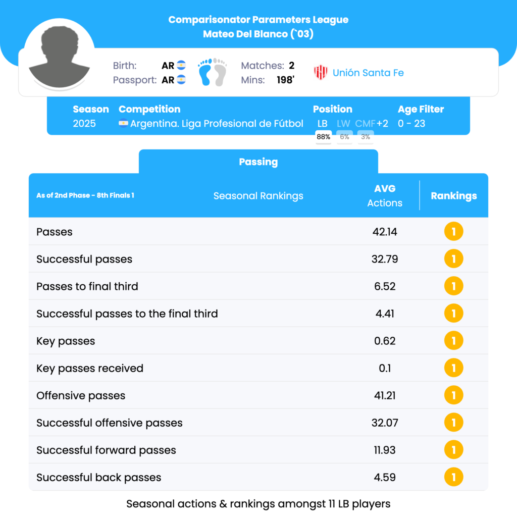 Mateo Del Blanco ranks 1st out of 11 LBs in total passes (42.14) and successful passes (32.79) per match. The gap to the next best player (Jano Gordon – 35.91 passes, 27 successful) highlights his central role in circulation. This volume suggests he can be a primary build-up outlet on the left side, capable of sustaining possession and dictating tempo from deep zones. He leads all peers in passes to the final third (6.52) and successful passes to the final third (4.41) per match, narrowly ahead of Elías Báez. In addition, he ranks 1st in progressive passes (11.07) and successful progressive passes (8.97) with an 81% success rate, the best in his cohort. This profile indicates a strong capacity to advance the ball under control, making him suitable for teams prioritizing positional play and structured progression from the back. Del Blanco is 1st in offensive passes (41.21), successful offensive passes (32.07), passes in the opposition half (23.45), and successful passes in the opposition half (18.24). Compared to the next closest player (Lautaro Vargas), the margins are significant. This points to sustained territorial presence and suggests he can operate almost as a left-sided distributor when the team settles in the opponent’s half.