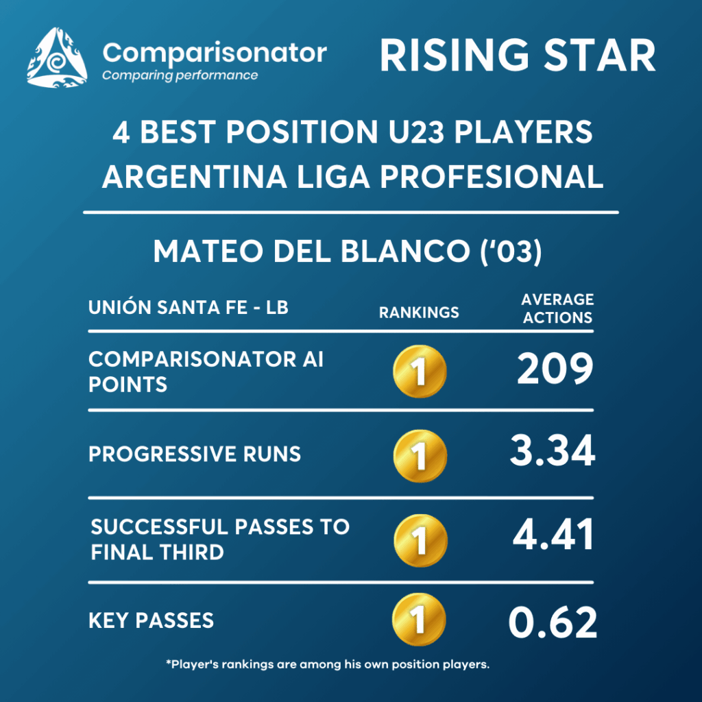 Mateo Del Blanco’s seasonal profile shows a dominant U23 left back in passing volume, progression, crossing, and territorial influence, consistently ranking 1st out of 11 in most core passing and progression metrics. His strengths clearly lie in ball circulation, advancing play from deep, and delivering from wide areas, both in open play and set pieces. From a tactical perspective, he may be best utilized as a high, possession-oriented left back or wing-back, tasked with maintaining width, progressing the ball, and supplying the box rather than acting as a central playmaking fullback. His weaknesses suggest that systems demanding frequent central combinations or creative through-ball responsibility from the fullback role may not fully align with his current profile.
