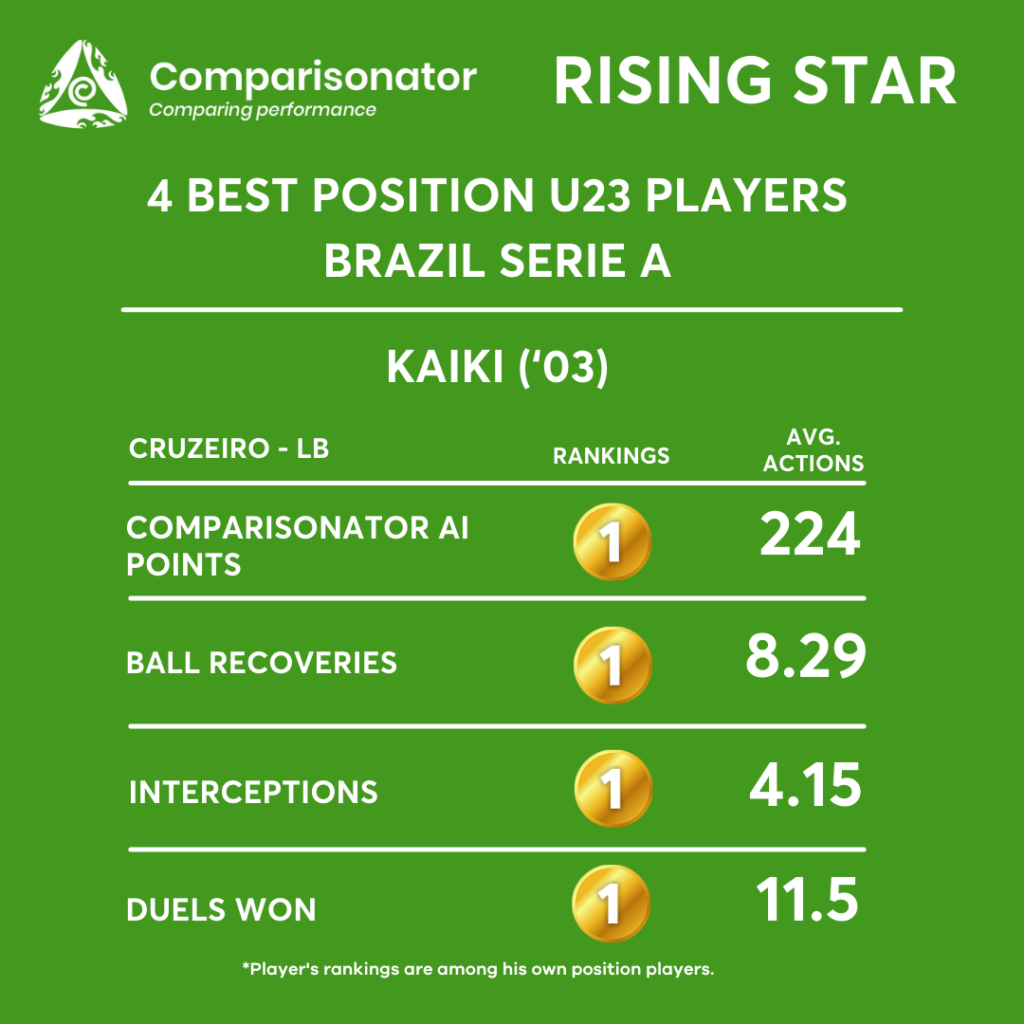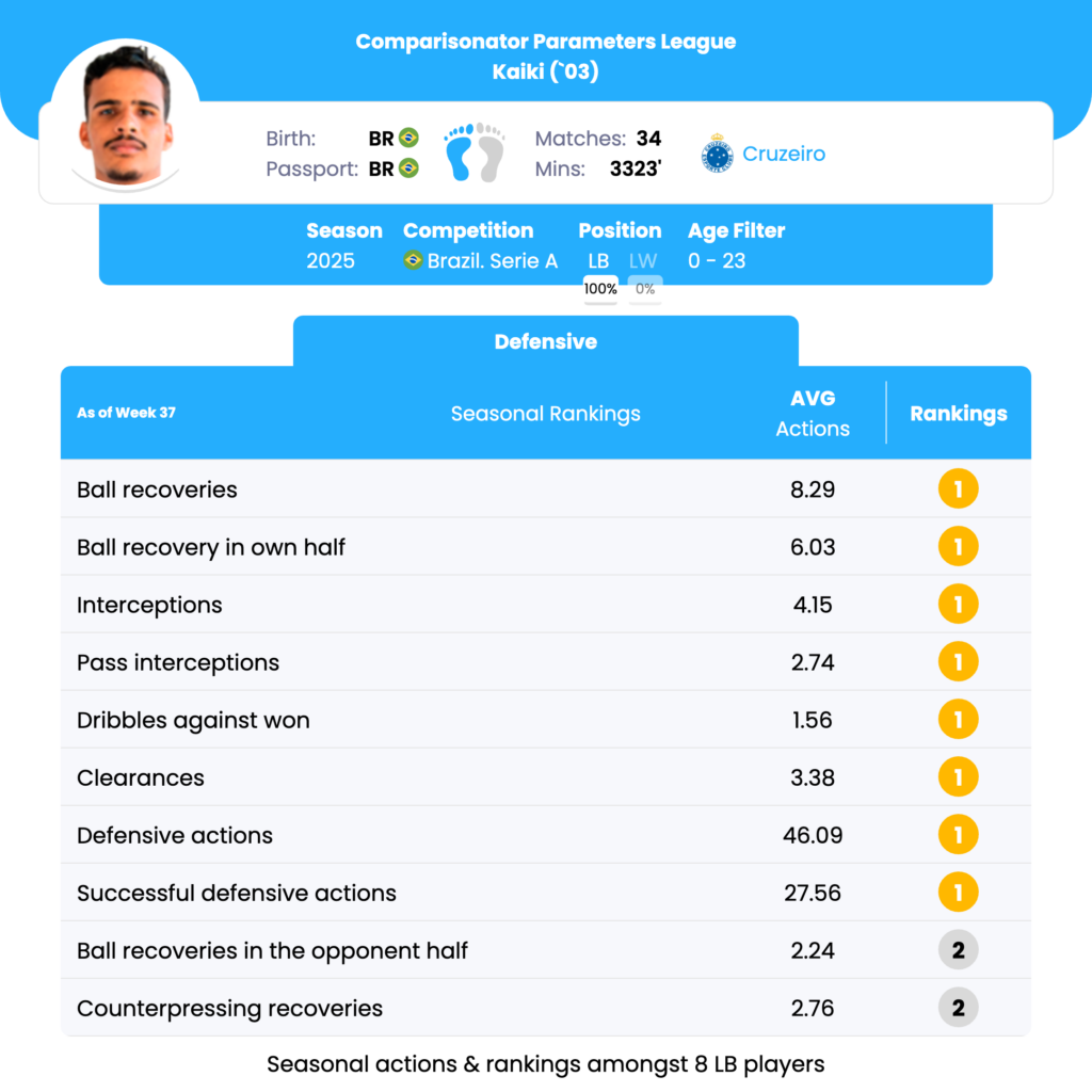 Kaiki’s best ranking parameters showcase his defensive strengths, particularly in ball recoveries, interceptions, and clearances. He leads his peers in several crucial defensive metrics, underscoring his ability to disrupt opposition play and safeguard his team’s defensive zones effectively. However, attention to ball retention and minimizing losses, especially in defensive areas, could further enhance his overall performance and tactical contribution.
