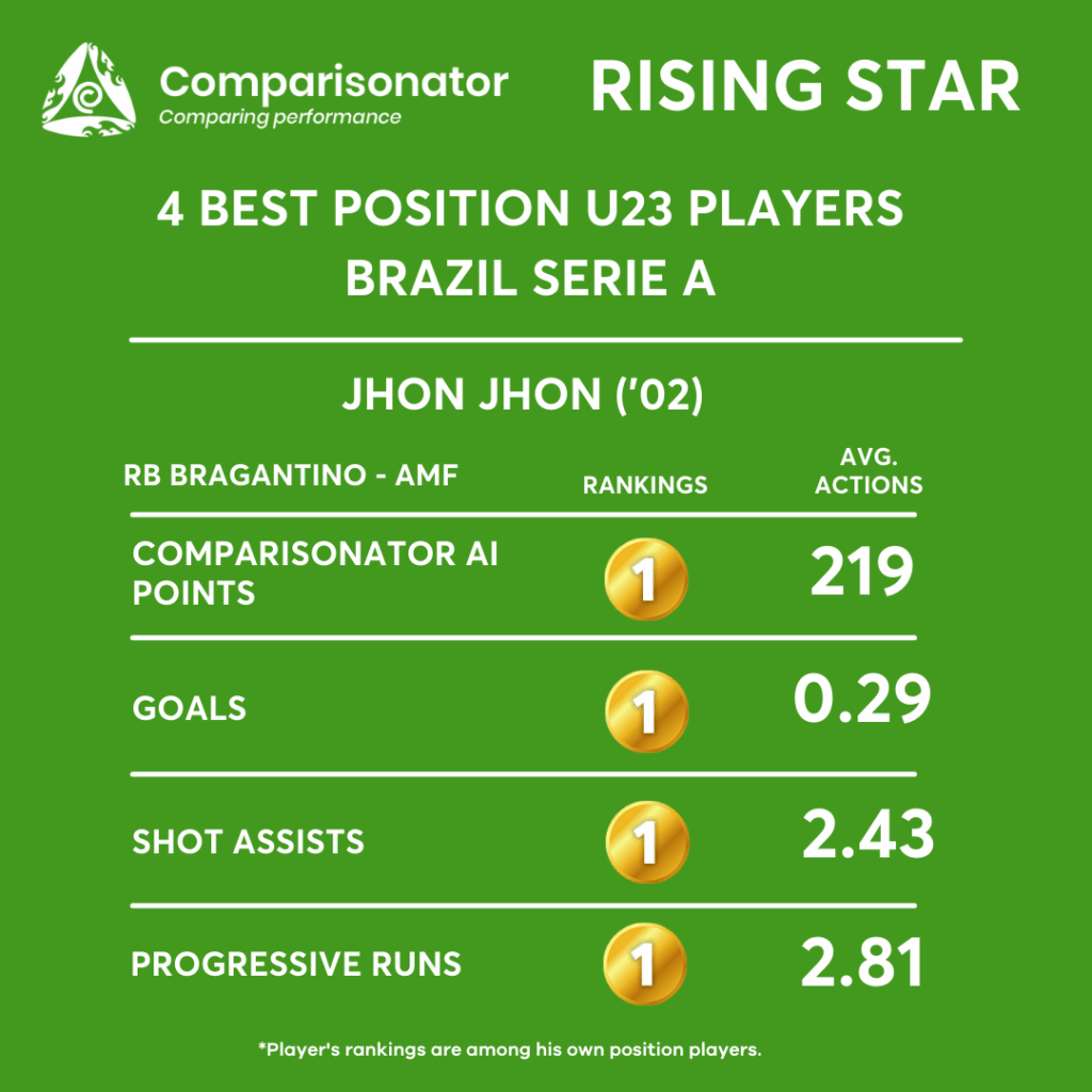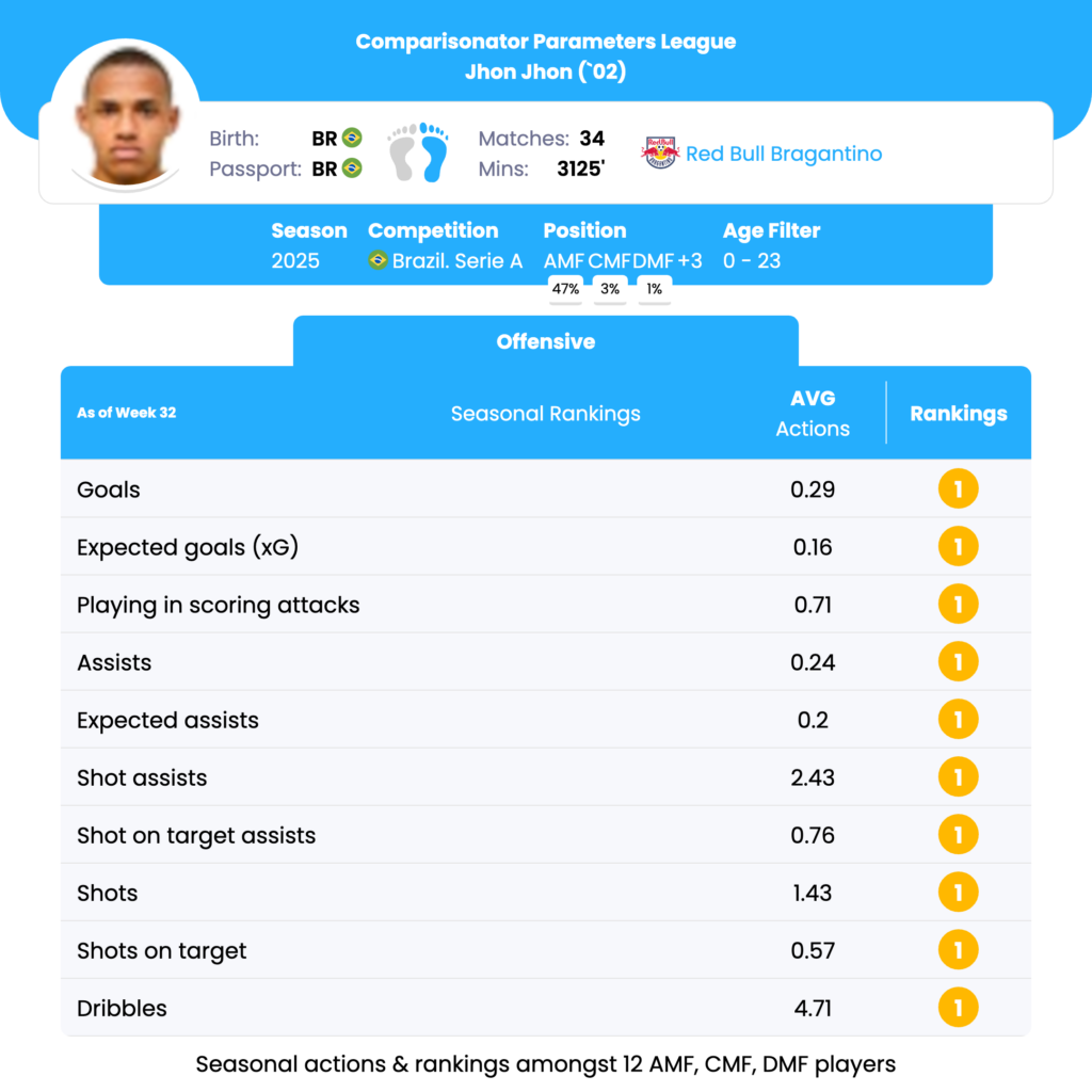 Jhon Jhon’s standout attributes include his goal-scoring ability, playmaking prowess, and dribbling skills, making him a critical offensive asset for Red Bull Bragantino. He leads in goals, expected goals, assists, shot assists, and offensive actions, showcasing his capability to both create and convert opportunities. However, refining his shooting efficiency and dribbling success rate could further elevate his performance, positioning him as an even more formidable attacking force.