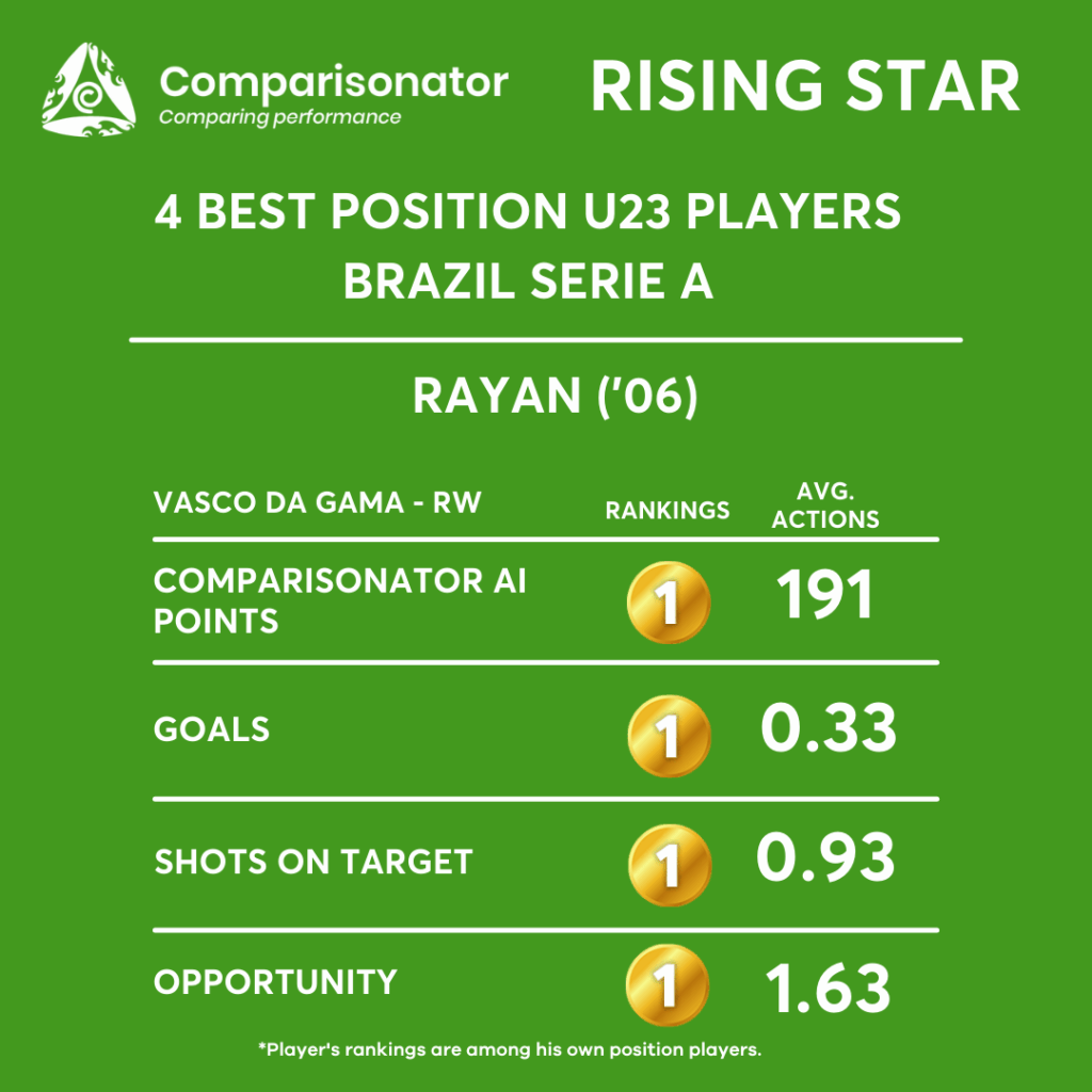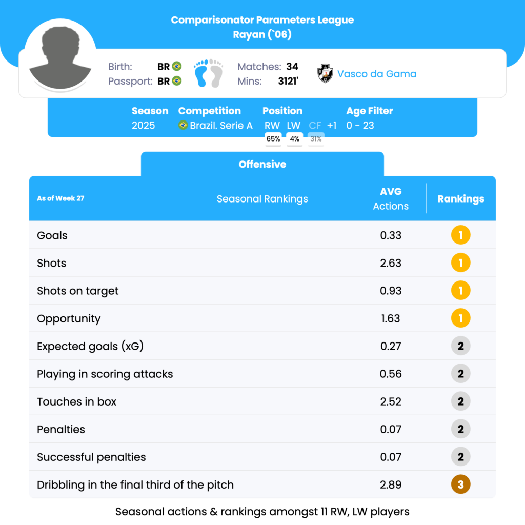 Rayan’s standout parameters include his goals, shots, and opportunities average per match, showcasing his prowess as a dynamic offensive player. His ability to consistently score and create chances positions him as a valuable asset in attacking strategies. However, there are opportunities to enhance his dribbling efficiency and shot accuracy, which could further elevate his impact on the pitch. By focusing on these areas, Rayan might become an even more formidable force for Vasco da Gama and potentially attract attention from larger clubs seeking promising young talents.