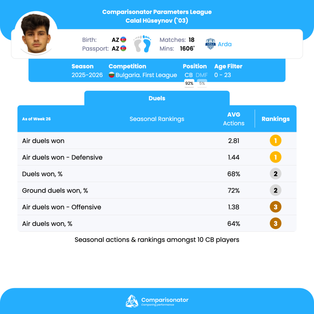 Calal Hüseynov’s strongest seasonal parameters are clearly concentrated in aerial dominance and duel efficiency, his profile indicates a centre-back who can be highly effective in low-to-mid block systems, defending crosses, set pieces, and direct play. Tactical usage may favor pairing him with a more proactive, ground-oriented centre-back, allowing Hüseynov to focus on aerial control, positional defending, and selective duels rather than pressing or ball-carrying responsibilities.
