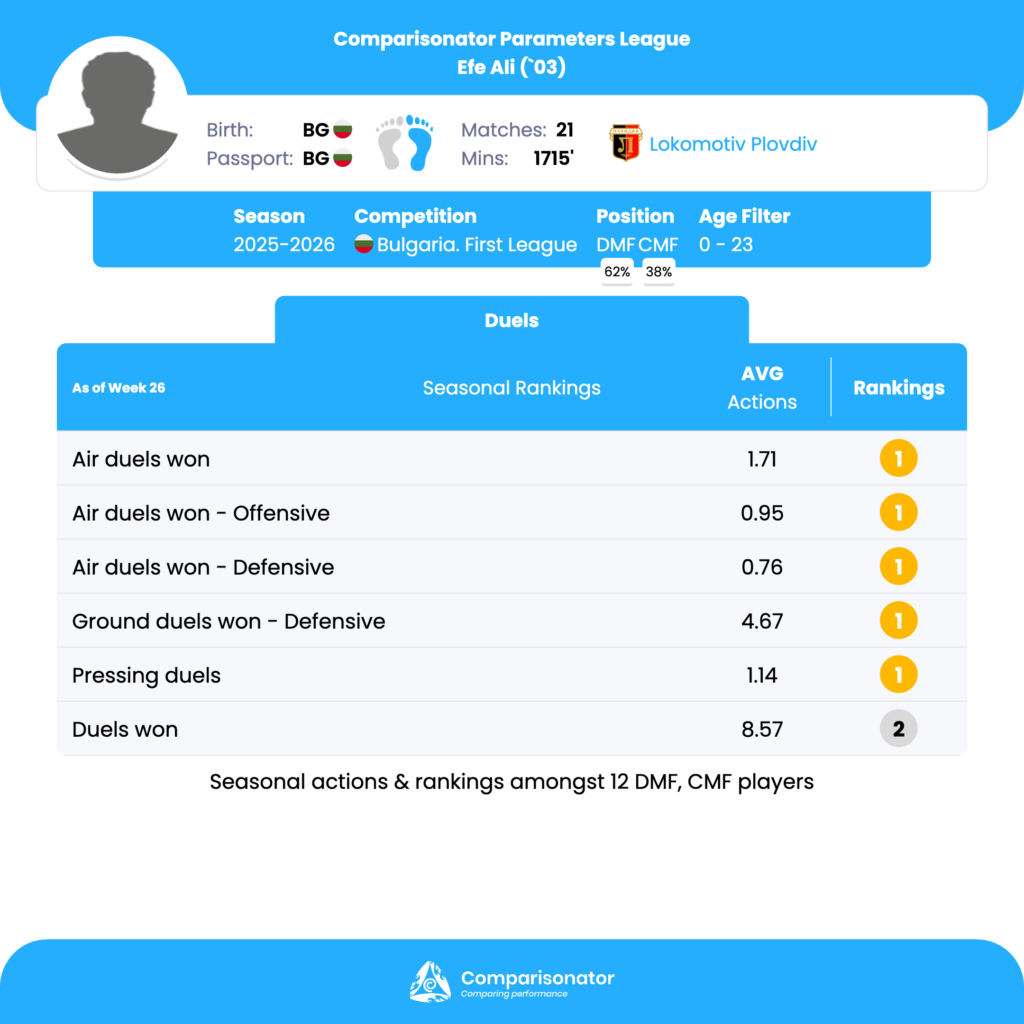 Efe Ali ranks 1st out of 12 in air duels won (1.71), offensive air duels won (0.95), and defensive air duels won (0.76) per match. He leads or marginally outperforms close competitors such as Berk Beyhan (1.5 total, 0.75 defensive) and Martin Smolenski (0.93 offensive). This consistent top ranking across all aerial duel subcategories indicates strong timing, positioning, and physical presence. Tactically, this profile can be valuable in midfield structures that rely on second-ball dominance, defending long passes, or attacking set-piece zones from deeper midfield positions. He ranks 1st out of 12 in defensive ground duels won (4.67) per match, slightly ahead of T. Marinov (4.62). This highlights a strong ability to regain possession through direct engagement rather than interception-based defending. From a tactical perspective, this can fit well in systems with aggressive midfield stepping, where the DMF or CMF is expected to engage ball carriers rather than hold space passively. Efe Ali also ranks 1st out of 12 in pressing duels (1.14) per match, ahead of Ismael Ferrer (1.0). This suggests proactive defensive behavior, particularly in moments of transition. He can be effective in mid-block or situational high-press schemes where the central midfielder is required to initiate pressure rather than merely cover passing lanes.
