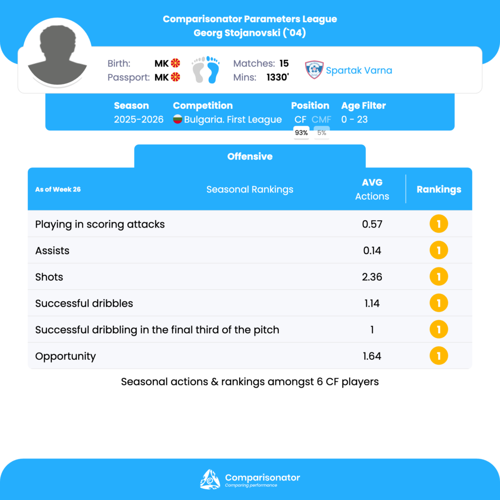 Georg Stojanovski’s seasonal profile is defined by elite attacking involvement, leading U23 CFs in offensive actions, shot volume, assists, dribbling success, and opportunities created. His xG ranking (2nd/6) supports the sustainability of his attacking presence. The main limitations appear in finishing efficiency, shot accuracy, and ball-carrying progression, which slightly cap his end product. Overall, the data points toward a high-activity, link-oriented striker whose value lies in offensive continuity and chance involvement rather than pure goal scoring.