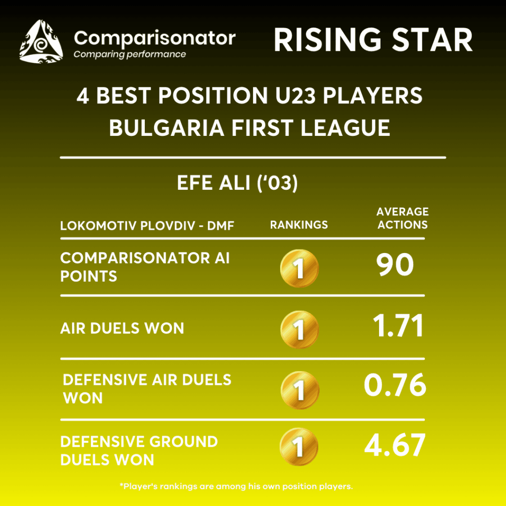 Efe Ali’s seasonal profile highlights elite performance in aerial duels won (overall, offensive, defensive), defensive ground duels won, and pressing duels, consistently ranking 1st or 2nd among U23 DMF/CMF peers. These strengths point toward a midfielder who can anchor physical battles, protect central zones, and support pressing structures.
