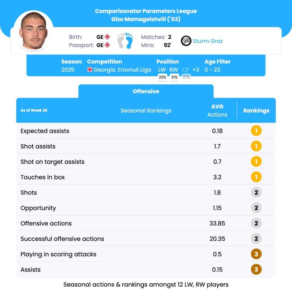 Gizo Mamageishvili’s strongest seasonal indicators are clearly in chance creation and offensive involvement, where he ranks 1st in Expected Assists, Shot Assists, Shot on Target Assists, and Touches in the Box. These metrics underline a profile of a creative wide attacker who consistently operates in dangerous zones and elevates teammates’ shooting quality.