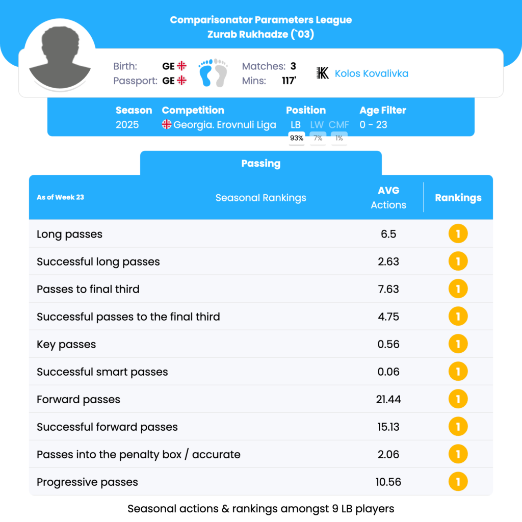 urab Rukhadze’s strongest seasonal indicators lie in progressive passing volume, forward distribution, final-third access, long passing activity, and set-piece delivery, where he consistently ranks 1st among U23 left backs in the league. His profile aligns with an attack-minded, high-risk full-back capable of driving territorial dominance through passing.