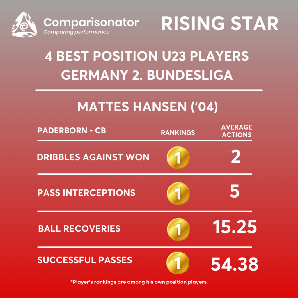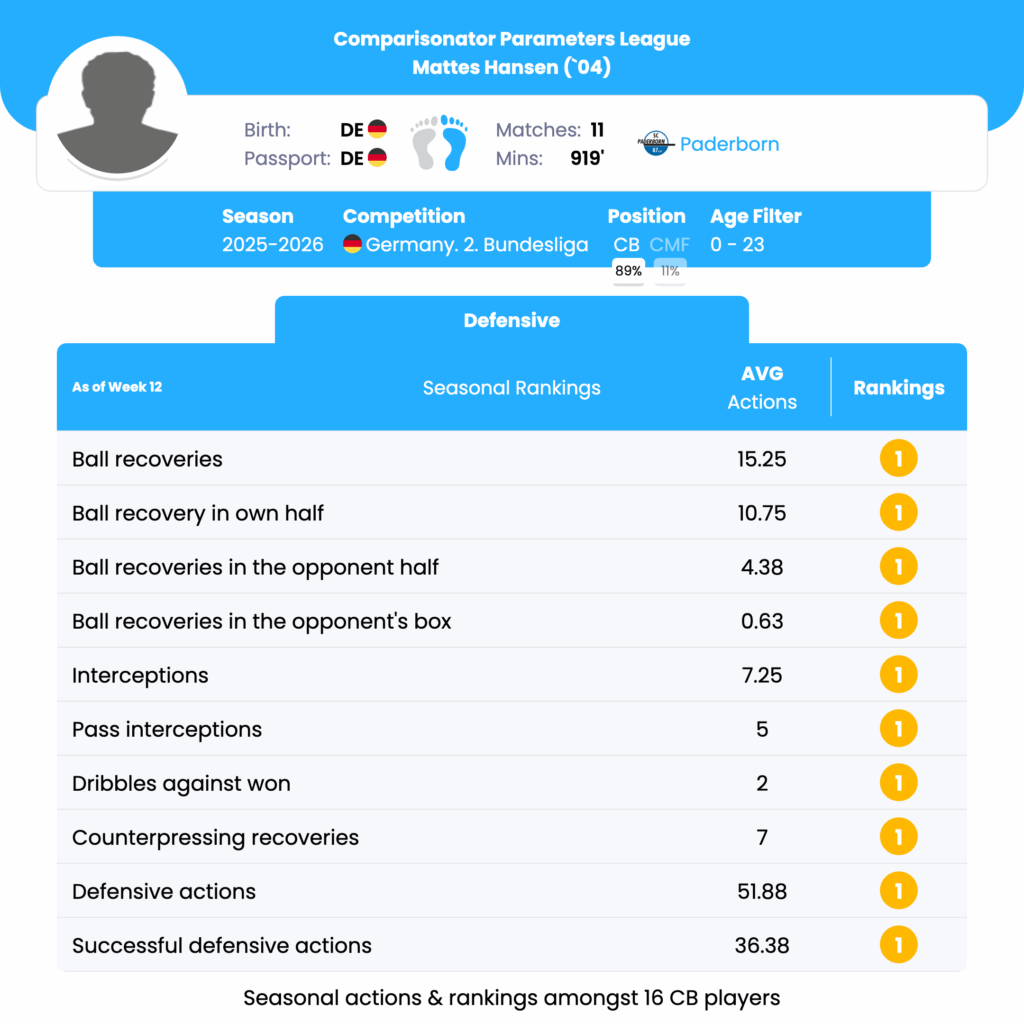 Mattes Hansen achieved the top ranking in ball recoveries, averaging 15.25 per match, surpassing Leandro Morgalla’s 12.13. This indicates Hansen’s exceptional ability to regain possession, a critical skill for disrupting opposition play and initiating counter-attacks. His proficiency in recovering the ball in both own half (10.75 average per match) and opponent half (4.38 average per match) further emphasizes his versatility and spatial awareness, offering tactical flexibility to either consolidate defensive structures or support offensive transitions. Hansen leads the league with 7.25 interceptions per match, ahead of Maximilian Dietz’s 5.4. His ability to anticipate and cut off opposition passes showcases his intelligence and reading of the game, making him a pivotal figure in intercepting threats before they develop. His positioning allows for quick possession changes, crucial for defensive solidity and counter-attacking opportunities.