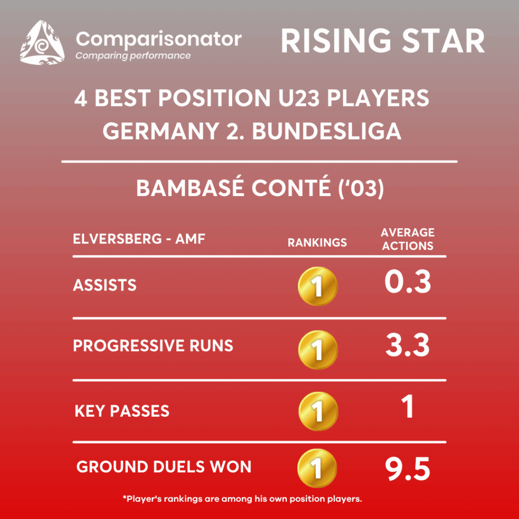 Conté leads in both expected goals and assists, with averages of 0.32 and 0.3 per match, respectively. These figures surpass the closest competitors, Jonas Therkelsen (0.3 xG) and Mehmet Aydin (0.2 assists). This indicates Conté’s capability to both score and set up goals consistently, making him a dual threat in offensive play. Tactically, this suggests utilizing Conté as a focal point in attacking strategies, capitalizing on his ability to convert opportunities and facilitate scoring chances. With an average of 3.3 progressive runs per match, Conté tops this category, outpacing Laurin Ulrich (3.08). Progressive runs reflect a player’s ability to advance the ball and penetrate defensive lines, which is crucial for creating attacking momentum. Conté’s proficiency in this area suggests deploying him in roles that require dynamic movement and transitional play.