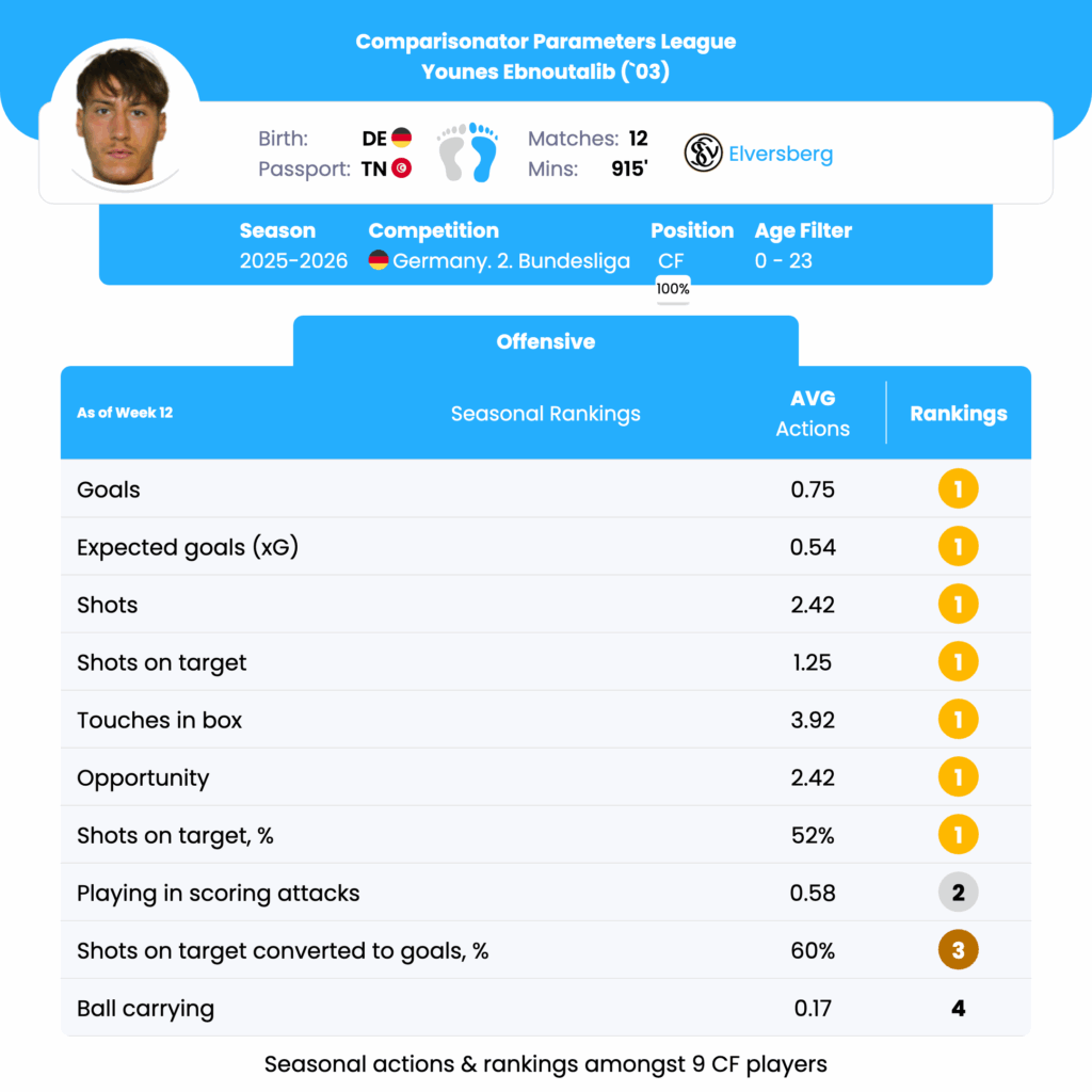 Younes Ebnoutalib’s strengths lie predominantly in scoring, positioning, and shot accuracy, where he consistently ranks at the top among young center forwards in the league. His ability to convert opportunities into goals and maintain a high presence in the box makes him a key offensive player. However, there are areas for improvement in playmaking, dribbling, and ball progression that could enhance his versatility and overall contribution to team dynamics. By focusing on these weaknesses, Ebnoutalib might develop into an even more complete forward, offering both scoring and creative support in attacking plays.