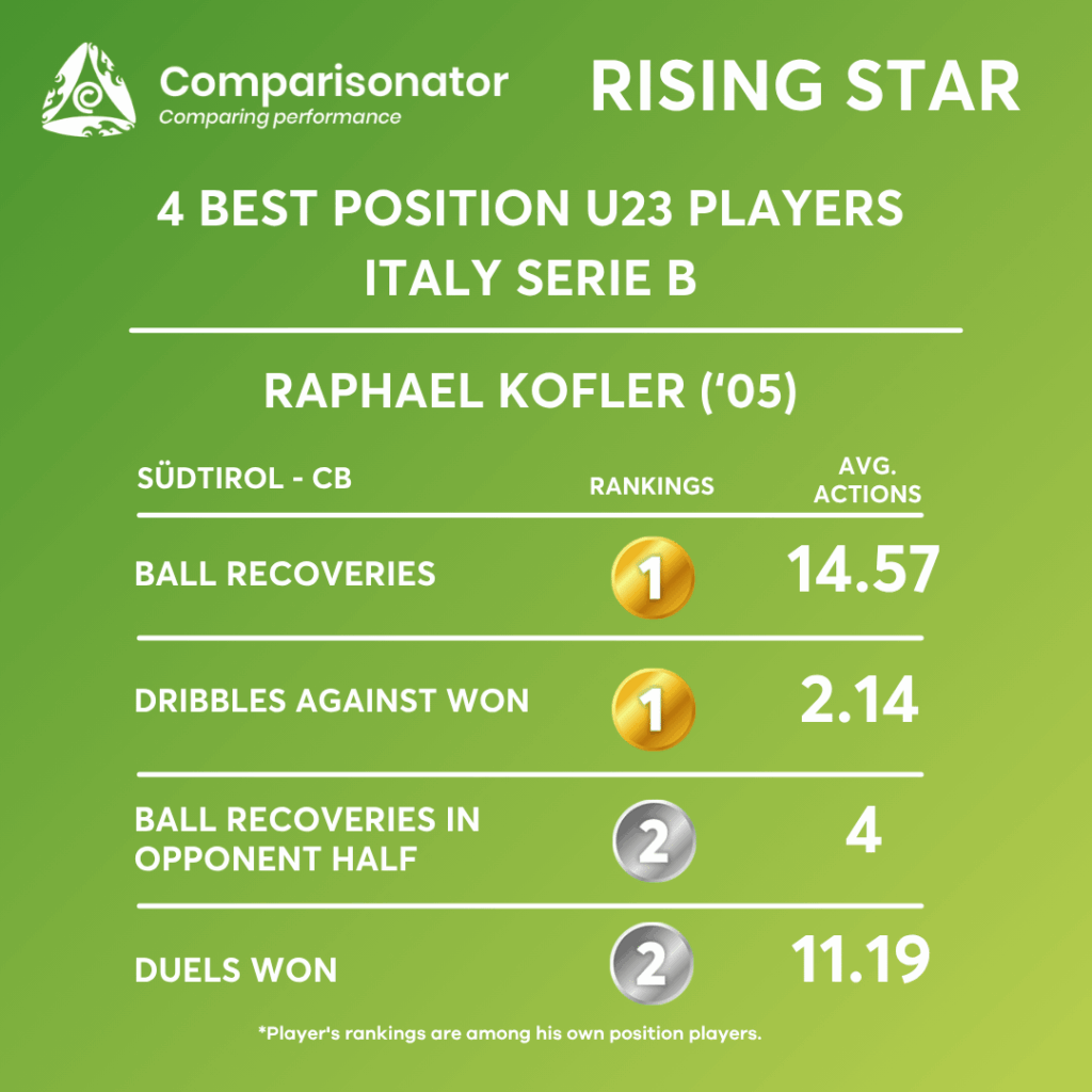 Raphael Kofler leads the rankings in average ball recoveries per match with 14.57, outperforming Franco Carboni who has 13.5. This indicates Kofler’s exceptional ability to regain possession and disrupt opponent play, which can be tactically significant in maintaining defensive solidity and initiating counterattacks. Ranking first in dribbles against won with 2.14, Kofler marginally outperforms Federico Davi who has 2. This suggests Kofler’s adeptness at challenging and overcoming opponents in one-on-one situations, which is crucial for breaking up attacks and maintaining defensive strength.