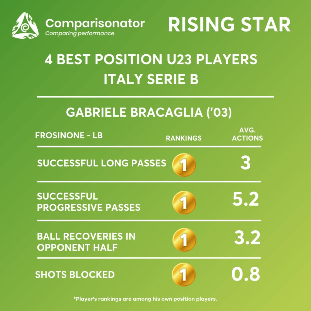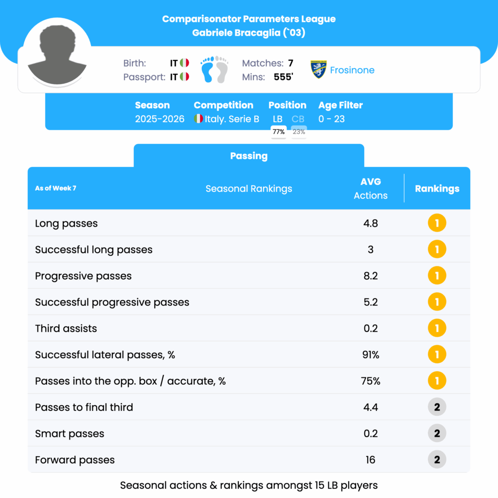 Gabriele Bracaglia’s best ranking parameters highlight his strengths in long-distance and progressive passing, lateral distribution, and precision in delivering the ball into dangerous areas. These abilities can be tactically leveraged to strengthen offensive transitions and maintain strategic pressure. While areas such as back passes, crossing accuracy, and short passing need improvement, focusing on these can enhance his overall reliability and effectiveness in diverse play situations.