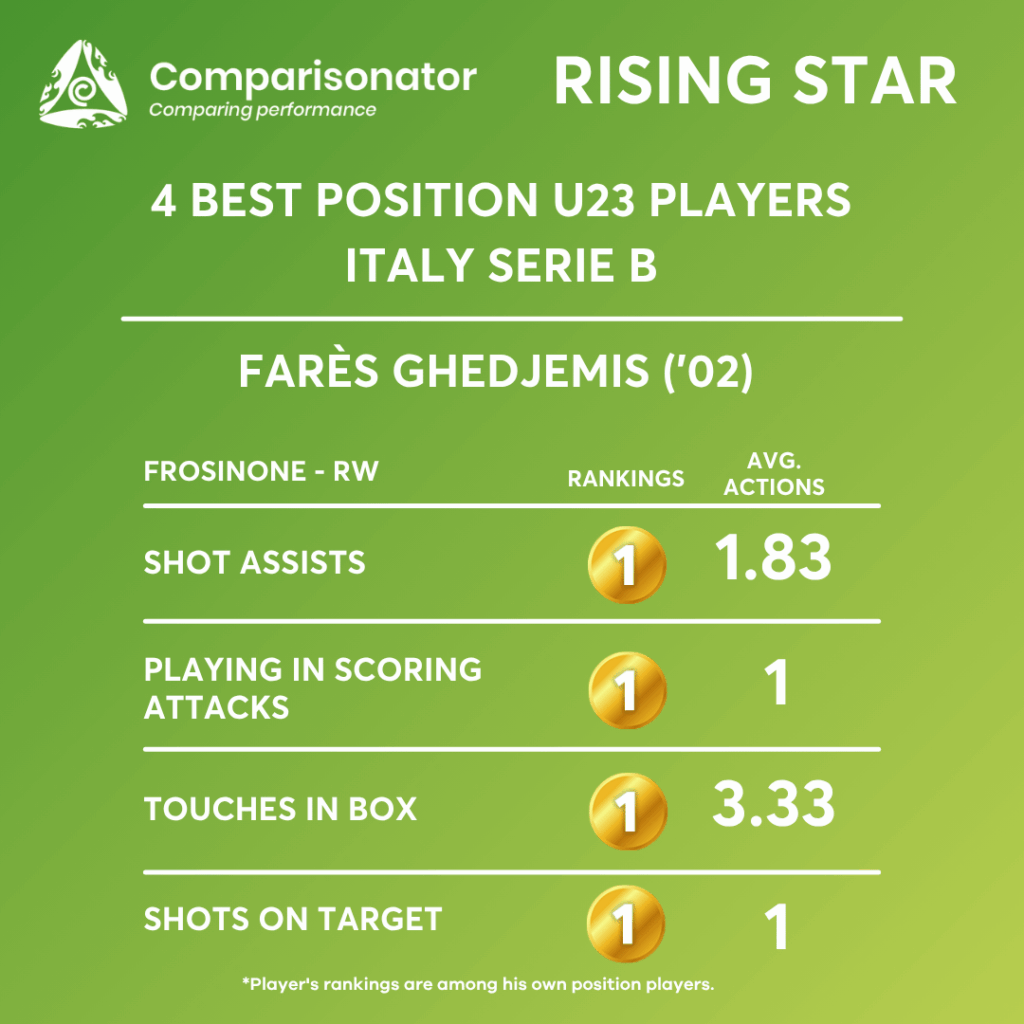Farès Ghedjemis excels in playing in scoring attacks, ranking 1st with an average of 1 per match, outperforming Simone Pafundi who holds the next best average of 0.75. This indicates Ghedjemis’s significant involvement in offensive plays that lead to scoring opportunities, showcasing his ability to position himself effectively within attacking sequences. His tactical significance in this area lies in his ability to consistently contribute to high-pressure situations, offering his team increased chances for goal-scoring opportunities. Ghedjemis leads in both shot assists and shots on target assists, averaging 1.83 and 1 per match respectively. He surpasses Davide Bragantini in these metrics, who averages 1.4 shot assists and 0.6 shots on target assists. This highlights Ghedjemis’s proficiency in facilitating shooting opportunities for his teammates, emphasizing his vision and precision in the final third. His tactical value is amplified by his ability to consistently create clear goal-scoring chances for his team. Ghedjemis averages 3.33 touches in the box per match, the highest among his peers, surpassing Antoine Hainaut. This reveals his capacity to penetrate defensive structures and maintain a presence in critical scoring zones. His frequent touches in the box suggest that he is consistently involved in attacking phases, providing his team with strategic positioning that can lead to goal-scoring opportunities.