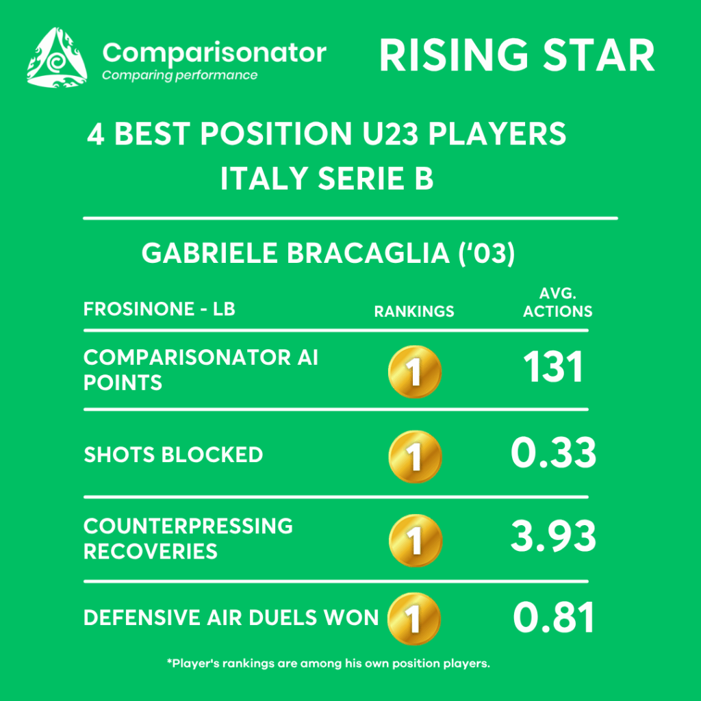Bracaglia’s strongest defensive output comes in ball-winning and recovery actions in deeper areas, where he ranks among the top performers in his position group. He is 1st out of 13 for Shots blocked (0.33), level with the best mark in the group and slightly ahead of Brando Moruzzi (0.30). He is also 1st out of 13 for Counterpressing recoveries (3.93), ahead of Stefano Di Mario (3.11). These two metrics point to a defender who can react quickly after possession loss, get involved immediately in second-ball situations, and protect the team’s defensive shape with active intervention. His next strongest area is a broad set of high-volume defensive contributions, where he remains near the top of the position rankings. He is 2nd out of 13 in Ball recoveries (7.56), just behind Stefano Di Mario (7.80), Ball recoveries in own half (4.96), behind Stefano Di Mario (5.69), and Ball recoveries in the opponent half (2.59), narrowly behind Costantino Favasuli (2.65). He also ranks 2nd out of 13 for Clearances (2.04), behind Moussa Mané (2.23), and Successful defensive actions (22.48), just behind Stefano Di Mario (22.74). This cluster shows consistency across both deeper defending and stepping into pressure zones higher up the pitch. For a tactical setup, he can be useful as an active full-back in a pressing team, because he contributes both to stopping attacks near his box and to regaining the ball higher up.