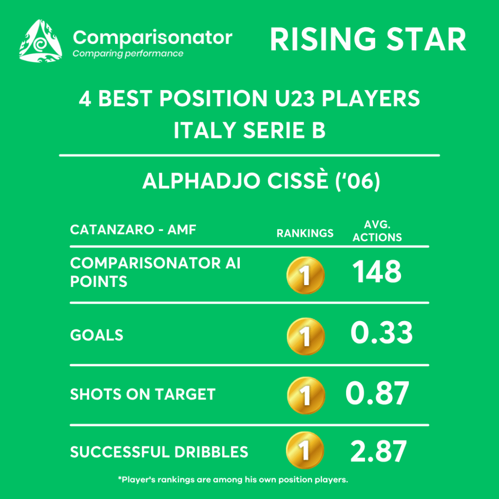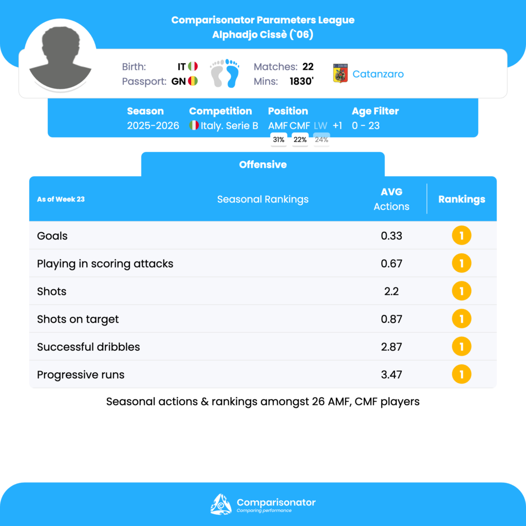 Alphadjo Cissè’s strongest seasonal output is in direct goal production and involvement around the box. He ranks 1st out of 26 AMF/CMF U23 players for Goals (0.33), Playing in scoring attacks (0.67), Shots (2.2), and Shots on target (0.87). He is also 1st for Dribbles (4.87), Successful dribbles (2.87), Dribbling in the final third (3.73), Successful dribbling in the final third (2.07), Progressive runs (3.47), Opportunities (1.47), Offensive actions (35), and Successful offensive actions (20.2). Relative to the category leaders, these are top-end numbers: for example, he leads Issa Doumbia in goals, shots, dribbles, and progressive runs, and leads Luis Hasa in multiple ball progression and offensive volume metrics. This profile points to a player who can repeatedly break lines, carry the attack forward, and finish moves himself rather than acting only as a connector. His dribbling volume and final-third ball progression are especially notable. Leading the group in Dribbles (4.87) and Successful dribbles (2.87), while also topping dribbling in the final third and successful dribbling in the final third, suggests he is a primary 1v1 threat who can destabilize defensive structures close to goal. The combination of 35 offensive actions and 20.2 successful offensive actions also indicates very high involvement in attacking sequences, not just isolated actions. Tactically, this can make him valuable as a central or left-sided attacking option who can receive between the lines, attack defenders, and create local superiority through carrying. His shot volume and attacking presence in advanced areas reinforce the same picture. With 0.67 playing in scoring attacks, 1.47 opportunities, 2.2 shots, and 0.87 shots on target per match, he is consistently around the final action. He also ranks 2nd for Expected goals (0.18) and Touches in box (2.47), behind Issa Doumbia in both, which shows his output is not only dribbling-based but also connected to box entry and shooting positions.