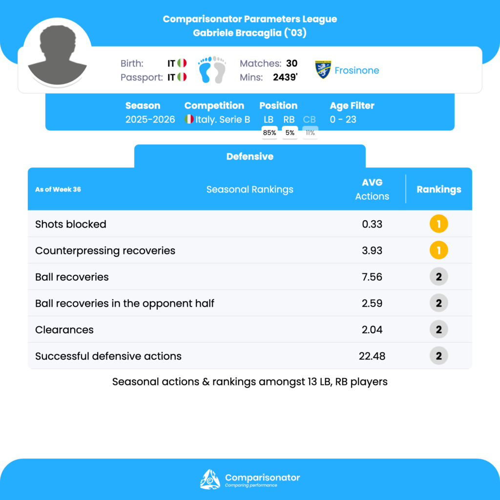 Bracaglia’s best ranking parameters are Shots blocked, Counterpressing recoveries, and the broader recovery set, especially Ball recoveries, Ball recoveries in own half, and Successful defensive actions. Overall, his seasonal profile points to a highly active defensive full-back with strong recovery instincts, good volume, and solid efficiency in defensive work. His main limitations are in advanced-area defensive disruption and 1v1 duel wins, which may affect his suitability as a lone wide defender in very aggressive defending structures. In tactical terms, he can be a strong fit in a compact or pressing system where he is asked to recover, support, and close space quickly, with cover around him when isolated.