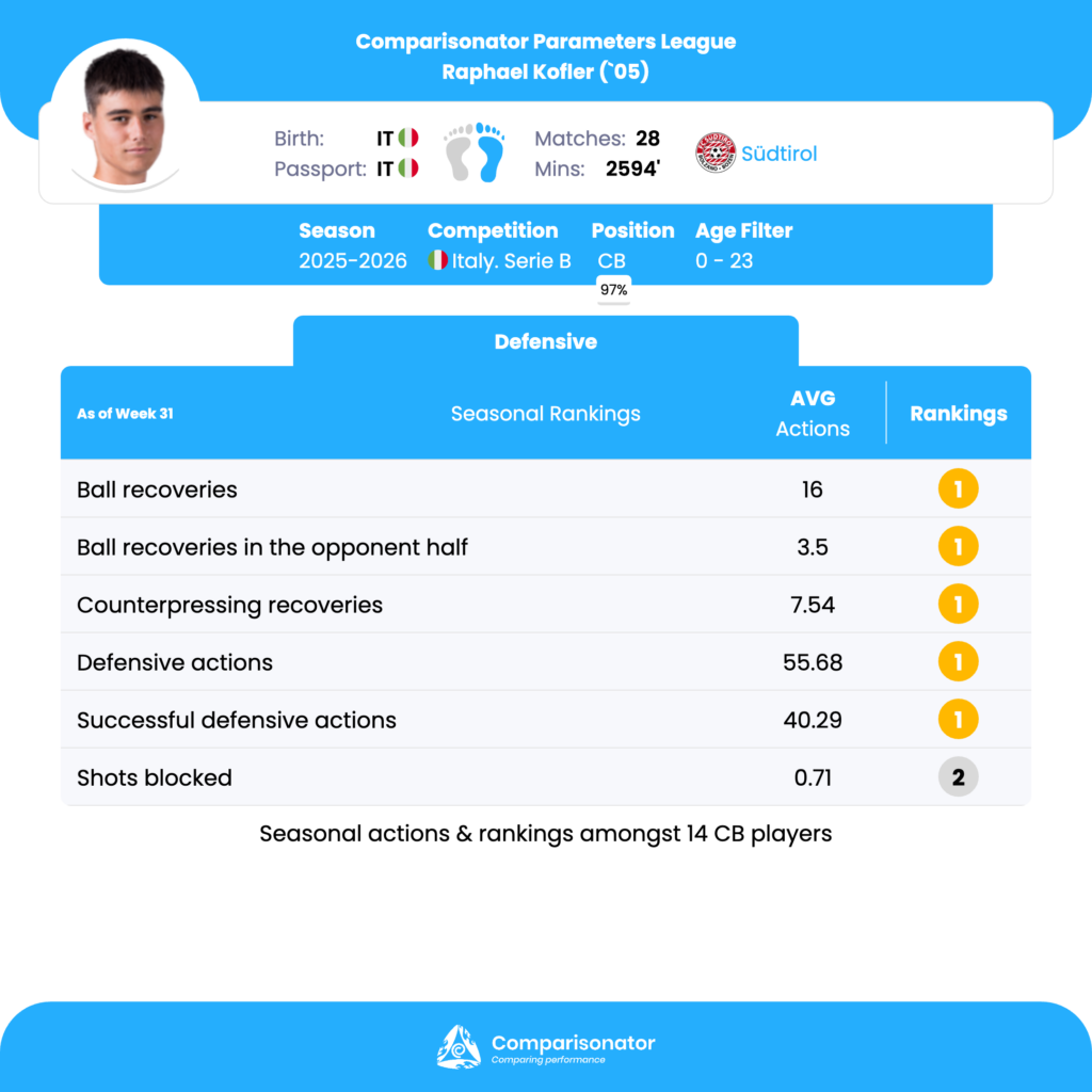 Raphael Kofler‘s CompaAI Parameters League Defensive report: