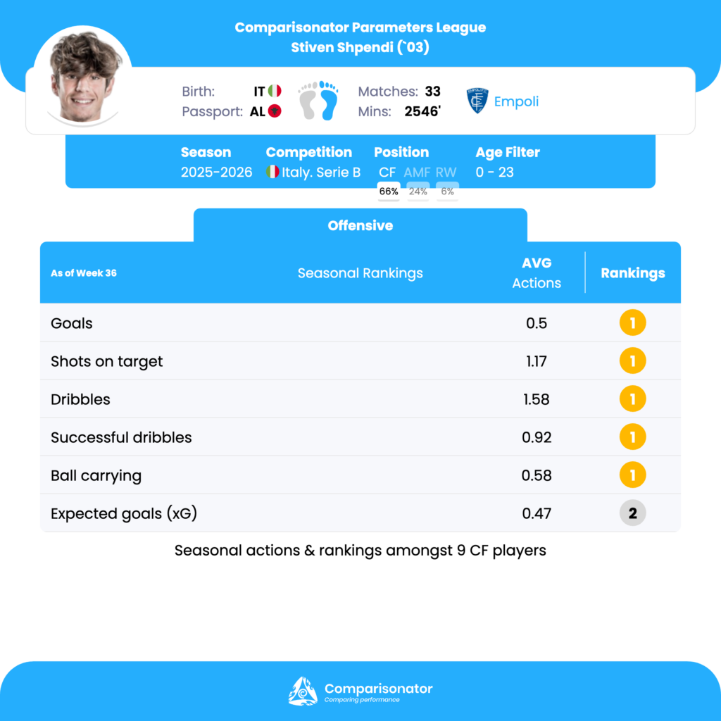 Direct goal threat and finishing output Shpendi’s strongest seasonal output is in end product. He ranks 1st out of 9 among U23 CFs with 0.5 goals per match, ahead of Antonio Raimondo at 0.33. He also ranks 1st in shots on target per match with 1.17, just ahead of Cristian Shpendi at 1.13. In addition, he is 2nd in shots on target converted to goals, % with 42.86%, behind Bogdan Popov at 62.5%. This points to a forward who gets shots on target consistently and can convert a good share of them. Tactically, he profiles as a penalty-box finisher who can be used as the primary attacking reference when the team wants repeated entries into shooting zones. 1v1 threat and progressive ball progression He also leads the group in several carrying and dribbling indicators. Shpendi is 1st in dribbles per match with 1.58, tied with Cristian Shpendi, and 1st in successful dribbles per match with 0.92, ahead of Cristian Shpendi at 0.9. He is also 1st in dribbling in the final third per match with 1.38, and 1st in successful dribbling in the final third per match with 0.88. These numbers indicate a forward who can beat defenders and carry pressure into dangerous areas, not just finish moves. From a tactical perspective, this gives him value in transition attacks, isolated 1v1 situations, and as a forward who can destabilize a compact back line by attacking the final third with the ball. High offensive activity and involvement in attacking phases Shpendi ranks 1st in offensive actions per match with 22.92, marginally ahead of Fabio Abiuso at 22.71. He is also 1st in successful offensive actions per match with 13.33, and 1st in successful offensive actions, % with 58.18%, again ahead of Abiuso at 56.35%. This shows a player who is highly involved in the attacking rhythm and can sustain a high volume of positive actions.