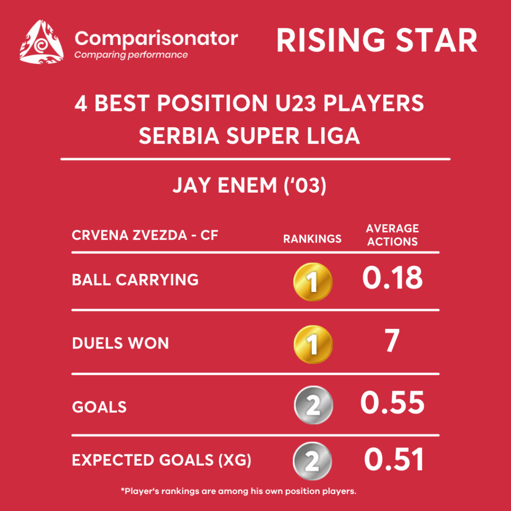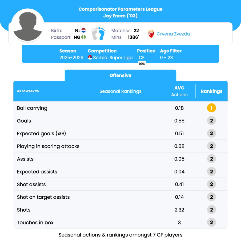 Jay Enem’s strongest seasonal parameters are Ball Carrying, Successful Dribbles %, Shots on Target Converted to Goals, and consistent rankings near the top for Goals, xG, and Offensive Actions among U23 CFs. His profile suggests a high-efficiency finisher with selective ball-carrying impact, rather than a volume shooter or creative hub.