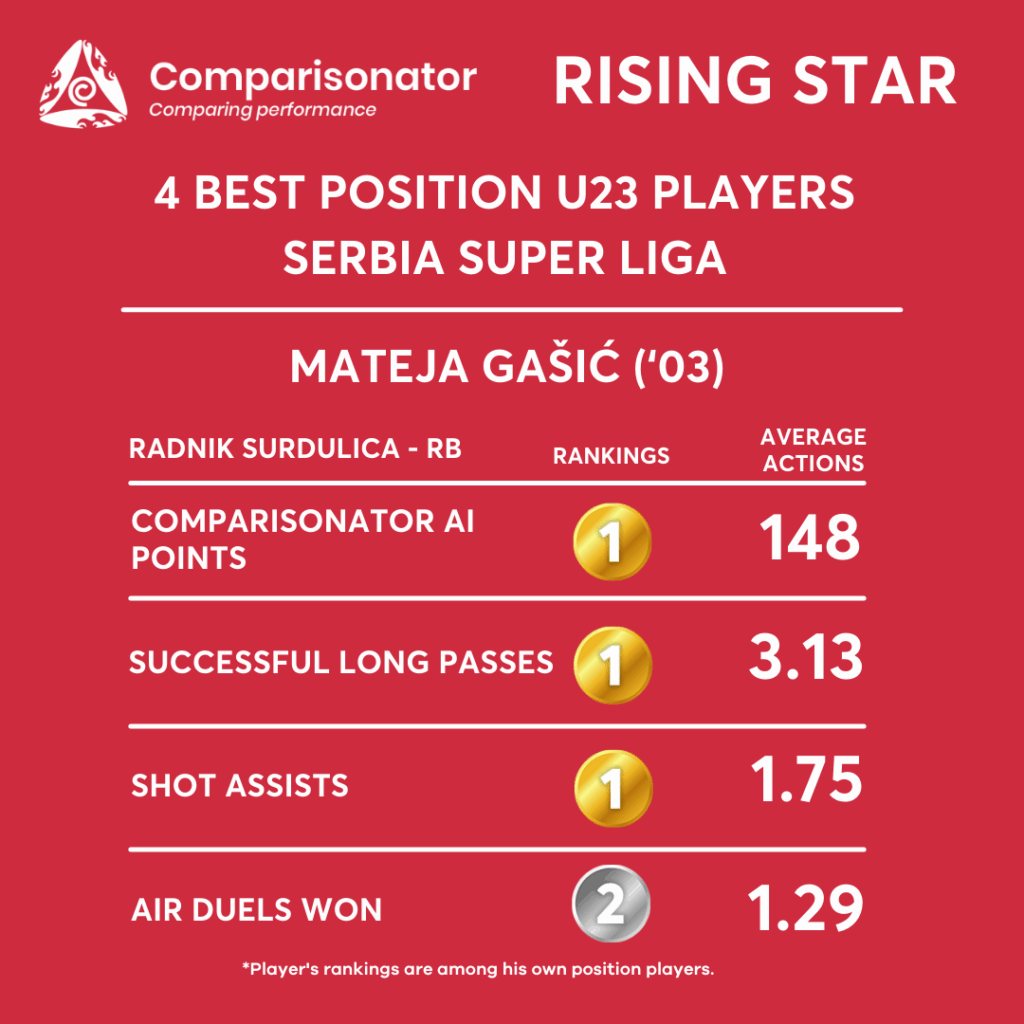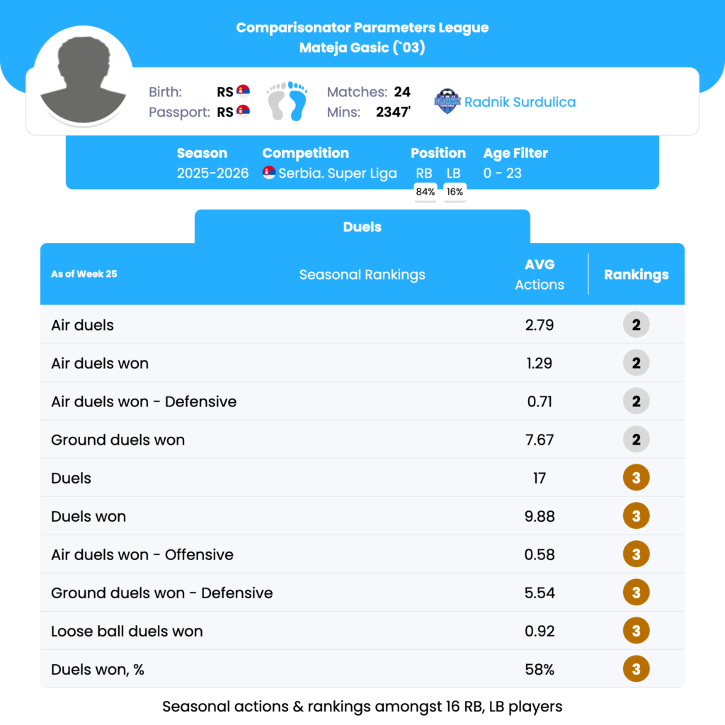 Mateja Gasic’s seasonal profile is defined by top-tier rankings in aerial involvement, ground duels won, total duels, and defensive duel actions, consistently placing him in the top 2–3 among U23 full-backs in Serbia. His data points toward a physically engaged, defense-oriented full-back who can be trusted in direct and transitional defensive scenarios.