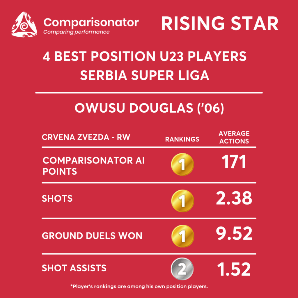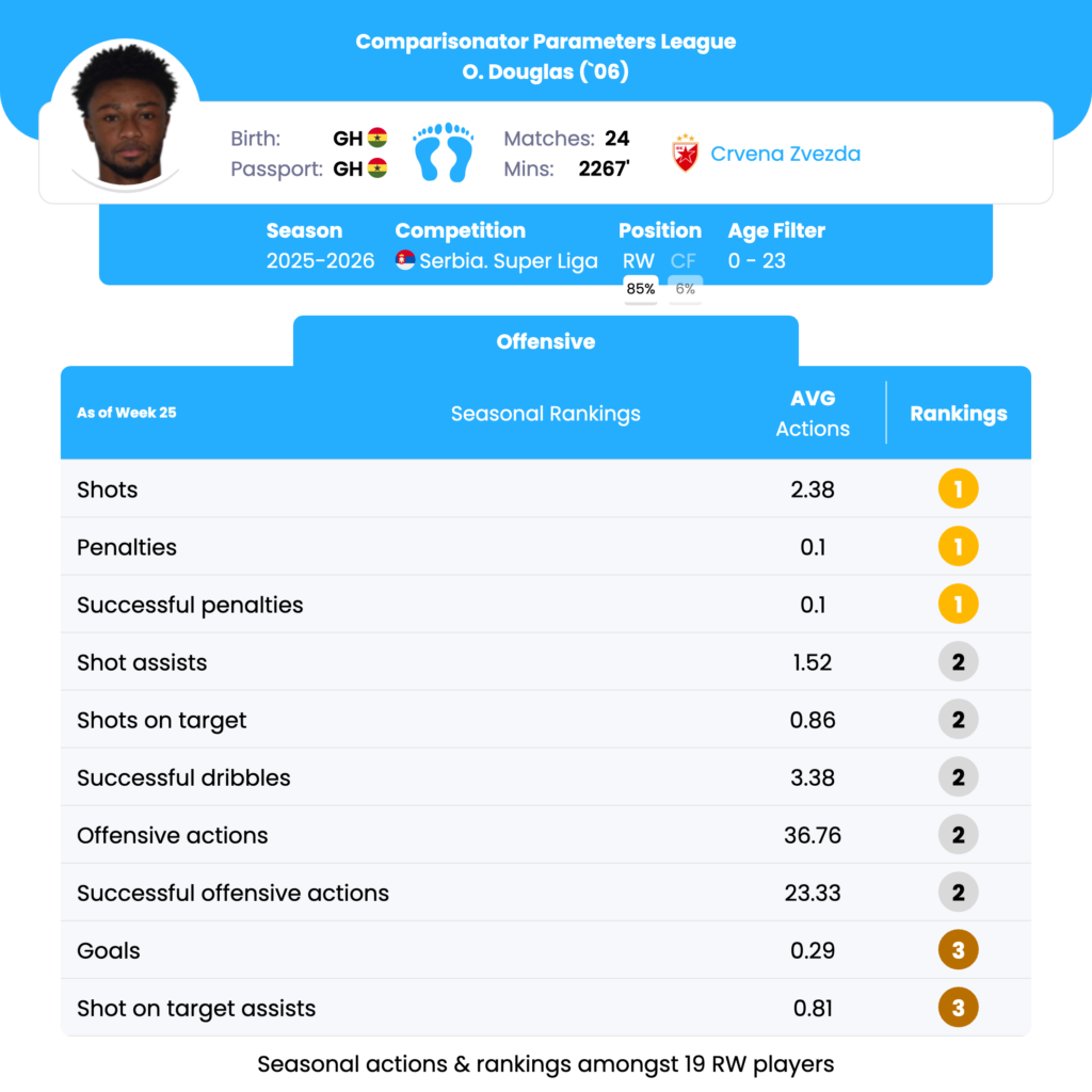 O. Douglas’ strongest seasonal parameters are shots per match (1st), penalty involvement (1st), shot assists (2nd), successful dribbles (2nd), and overall offensive actions (2nd) among U23 right wingers. His profile suggests a high-volume, aggressive wide attacker who consistently drives play forward and applies pressure in the final third.
