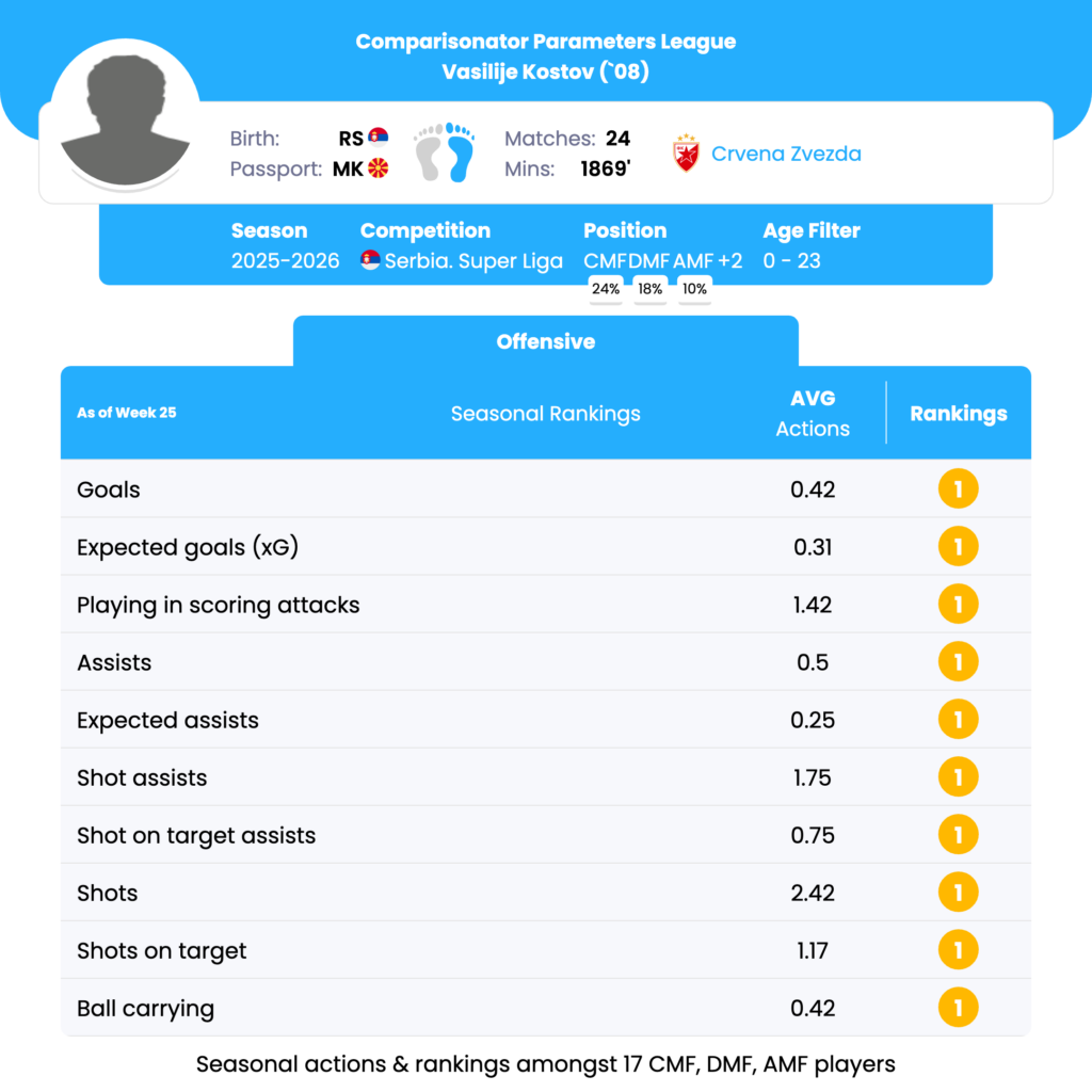 Vasilije Kostov’s seasonal profile is defined by top-ranked goal scoring, chance creation, shooting volume, and involvement in scoring attacks, all within the under-23 CMF/DMF/AMF comparison group. His strongest parameters include Goals, xG, Assists, xA, Shot Assists, Shots, Shots on Target, Touches in the Box, and Successful Offensive Actions, where he consistently ranks 1st or 2nd.