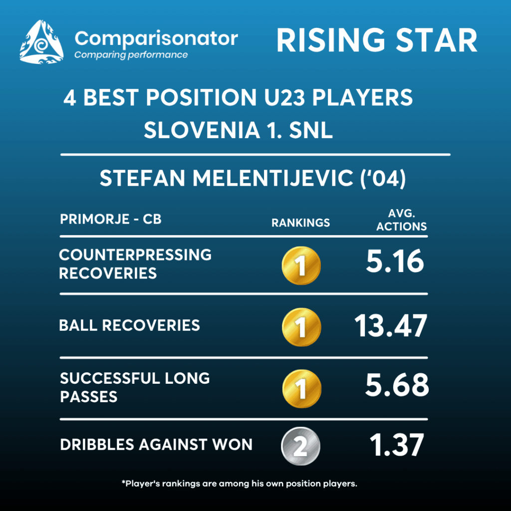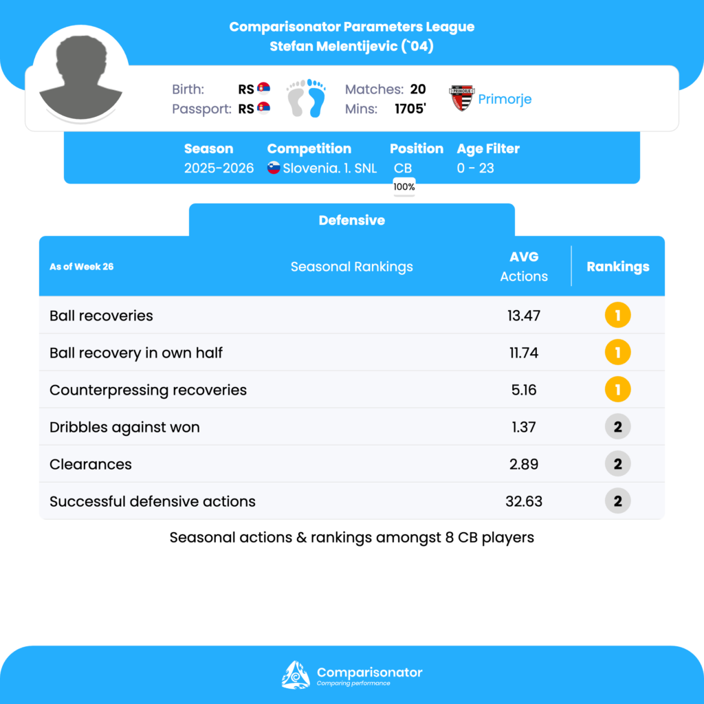 Stefan Melentijevic’s seasonal defensive profile is defined by elite ball recovery numbers, strong counterpressing output, and high-volume defensive involvement, all within the under-23 CB cohort. His best-performing parameters—Ball Recoveries, Own-Half Recoveries, Counterpressing Recoveries, Defensive Actions, and Successful Defensive Actions—position him as a highly active, reliable defender in sustained defensive phases.