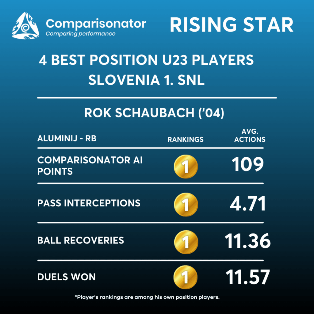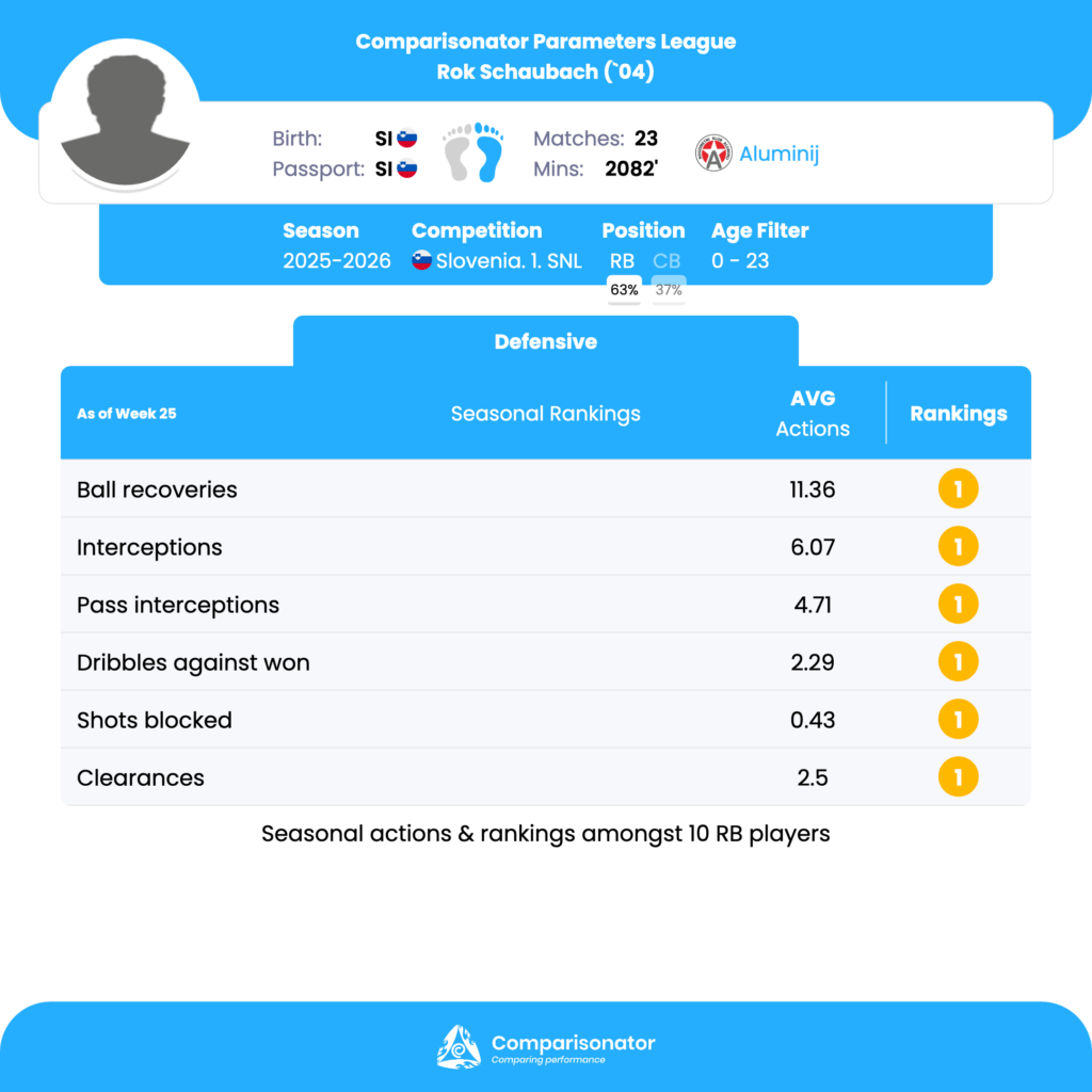 Rok Schaubach’s strongest parameters are ball recoveries, interceptions, total defensive actions, successful defensive actions, and 1v1 defensive wins, all ranked 1st among U23 RBs in the league. His profile describes a defensively dominant, high-volume, positionally intelligent fullback with strong last-line reliability.