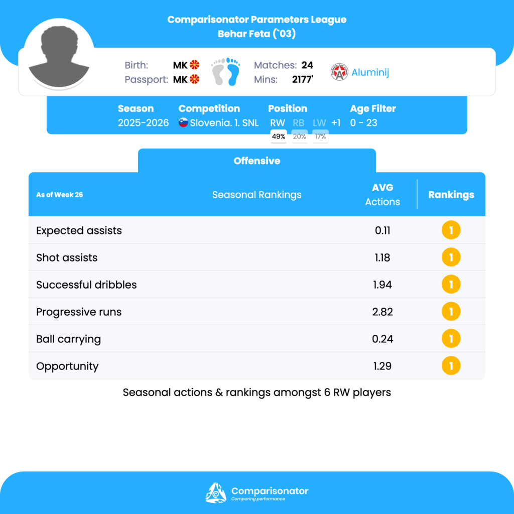 Behar Feta’s strongest seasonal rankings come in Expected Assists, Shot Assists, Progressive Runs, Offensive Actions, Successful Offensive Actions, Successful Dribbles, and Opportunities Created, where he consistently ranks 1st out of 6 among U23 right wingers. His statistical profile highlights a creative, ball-dominant winger with strong progression and 1v1 ability. While his finishing efficiency and scoring output are less dominant compared to his creative metrics, his overall offensive contribution places him among the most impactful wide players in his age group within the league.