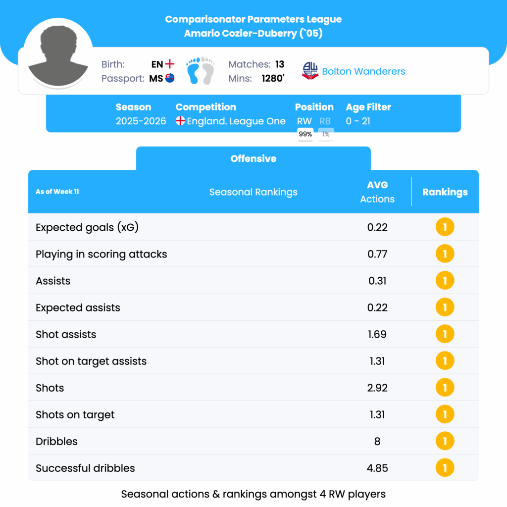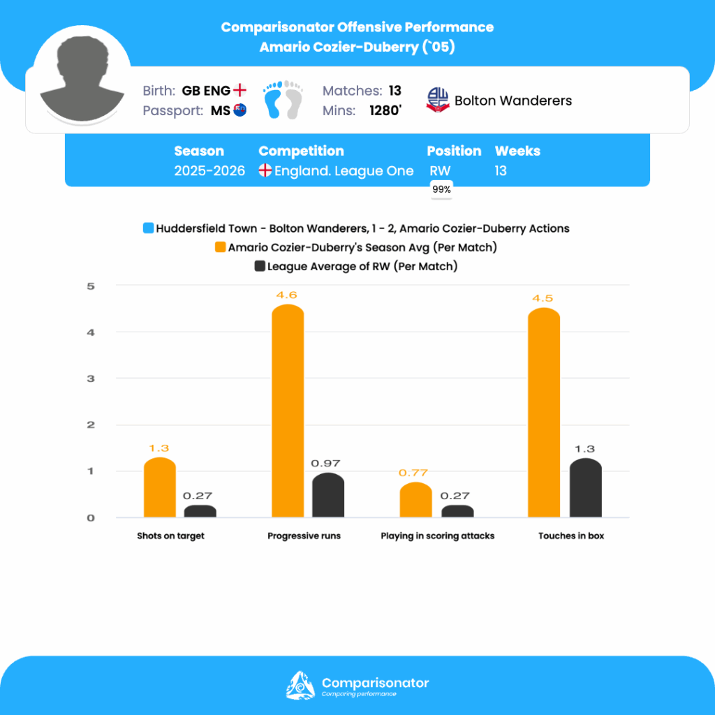 Amario Cozier-Duberry’s most impressive parameters are his expected goals, assists, shot assists, dribbling, and progressive runs. These aspects of his play showcase his offensive prowess, particularly in creating and facilitating scoring opportunities. However, his goal-scoring and ball carrying abilities are areas where further development may enhance his overall impact on the field. Tactical usage should emphasize his strengths in playmaking and ball progression while addressing his finishing and retention skills for a more well-rounded contribution.