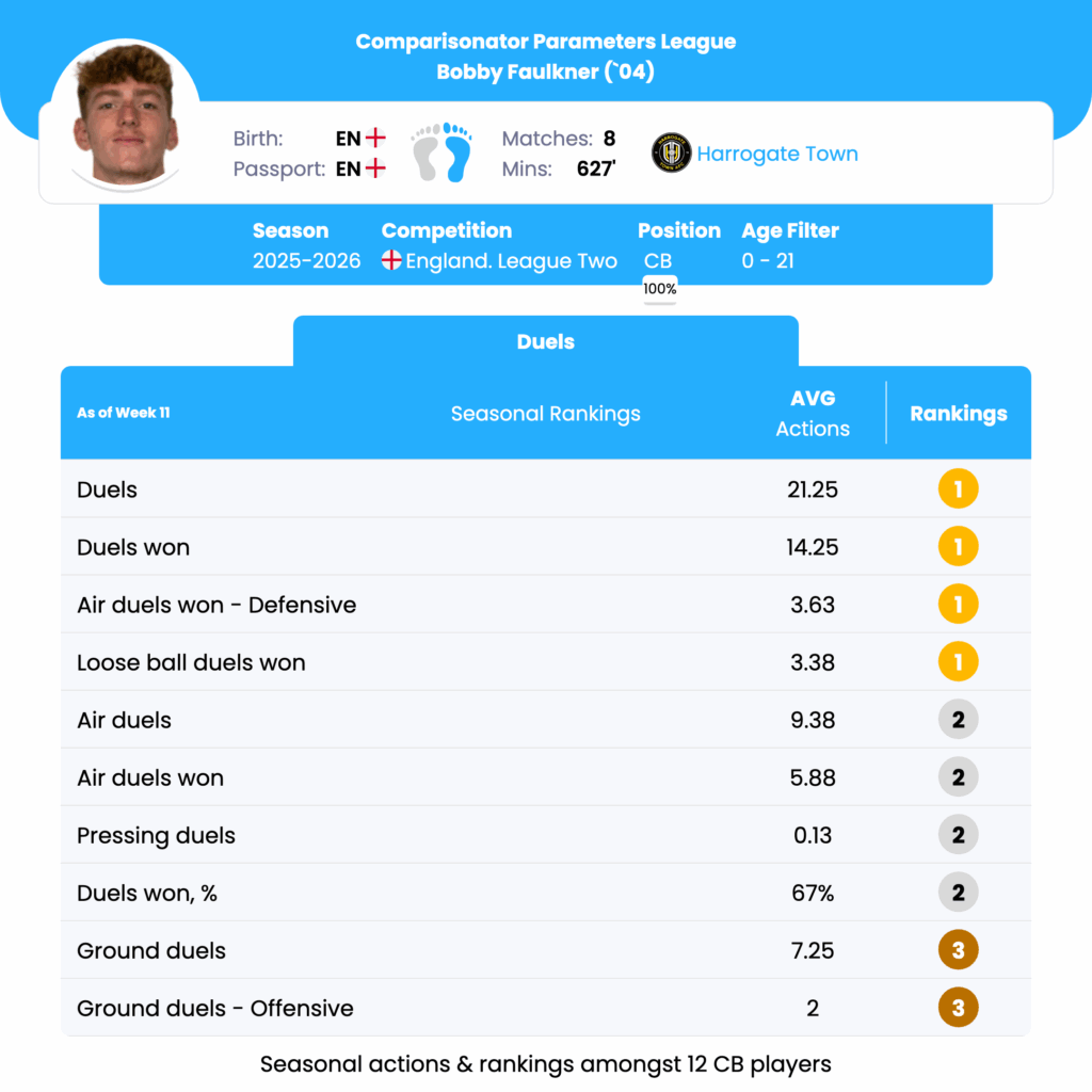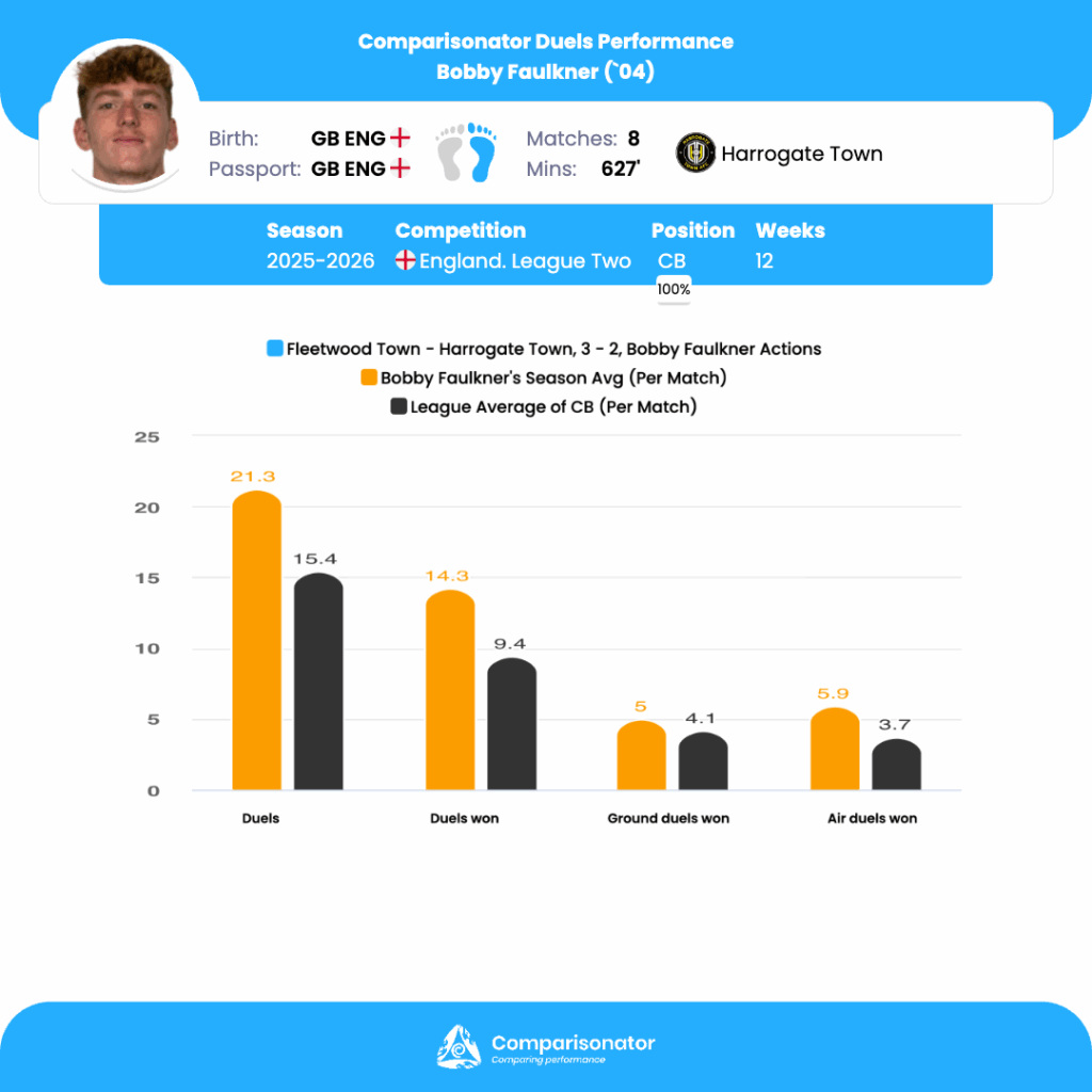 Bobby Faulkner’s most notable strengths lie in his ability to consistently engage in and win duels, both aerially and on the ground, particularly in defensive situations. His top rankings in duels average, duels won, and defensive air duels won highlight his significant contributions to Harrogate Town’s defensive capabilities. While his performance in offensive air duels and ground duels presents areas for potential development, his current strengths provide a solid foundation for his role as a central figure in defensive matchups and possession recovery.