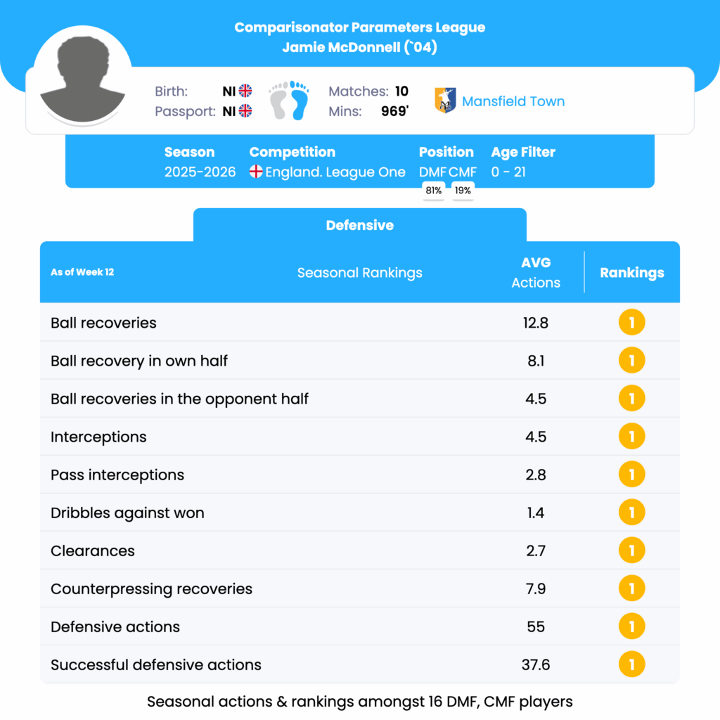 Jamie McDonnell’s standout parameters are his ball recoveries, interceptions, counterpressing recoveries, and successful defensive actions, all of which position him as a top performer in defensive roles. However, his ball retention, especially in his own half, requires attention to minimize potential risks and enhance overall team possession dynamics.
