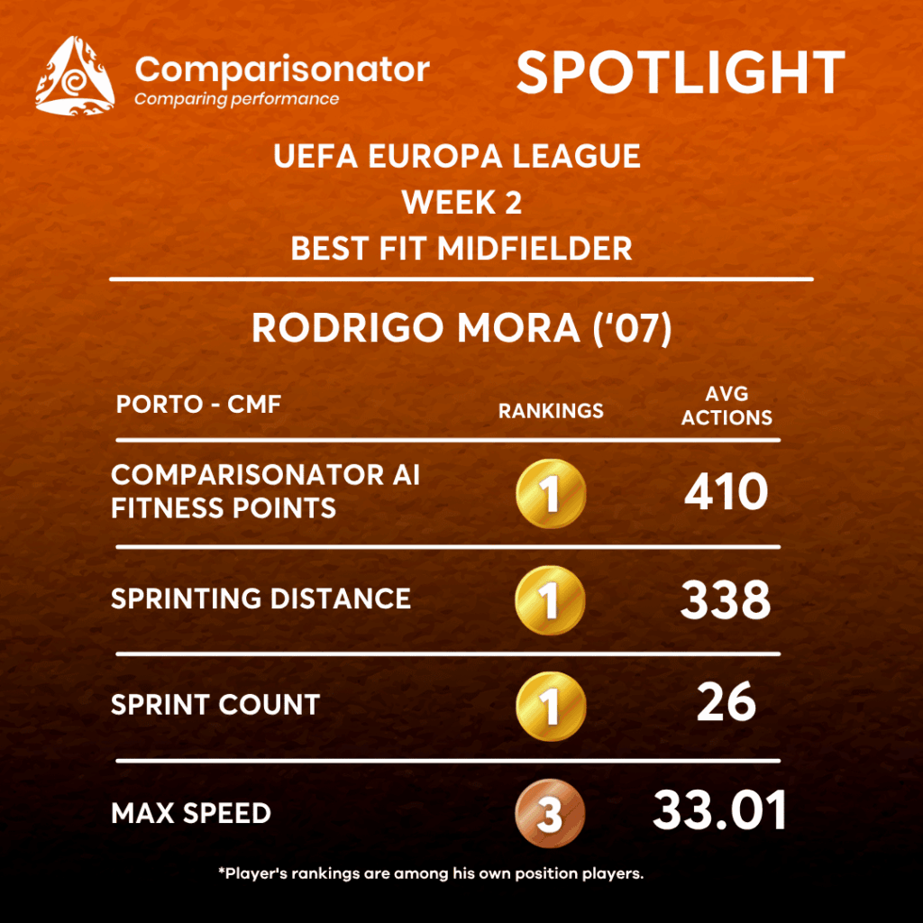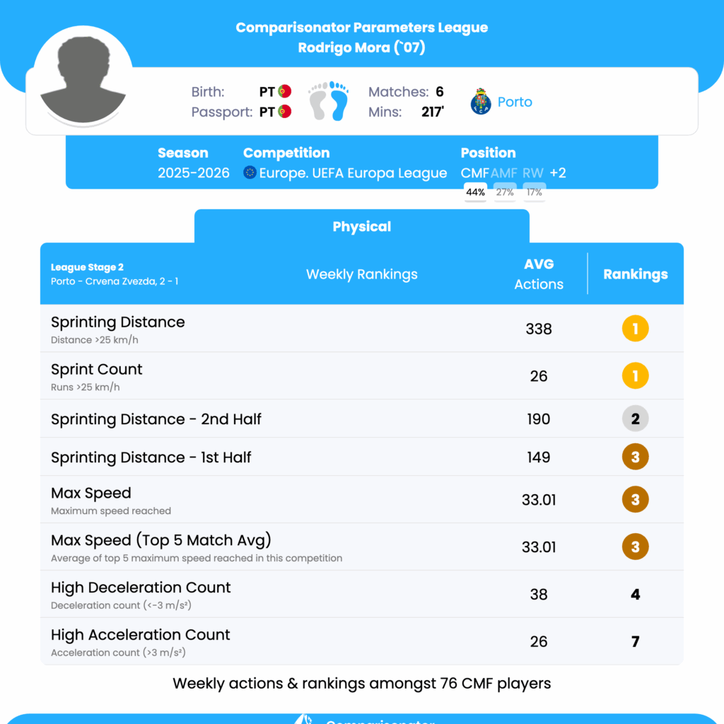 Rodrigo Mora’s best ranking parameters in the selected matches reveal his significant strength in physical performance metrics. His top rankings in sprinting distance and sprint count underscore his high energy levels and stamina, essential for a central midfielder tasked with bridging defense and attack. Additionally, his noteworthy maximum speed further adds to his dynamic profile, making him a valuable asset in high-tempo games where quick transitions are pivotal. These attributes tactically benefit Porto by enabling Mora to effectively disrupt opposition plays and contribute to swift offensive maneuvers.