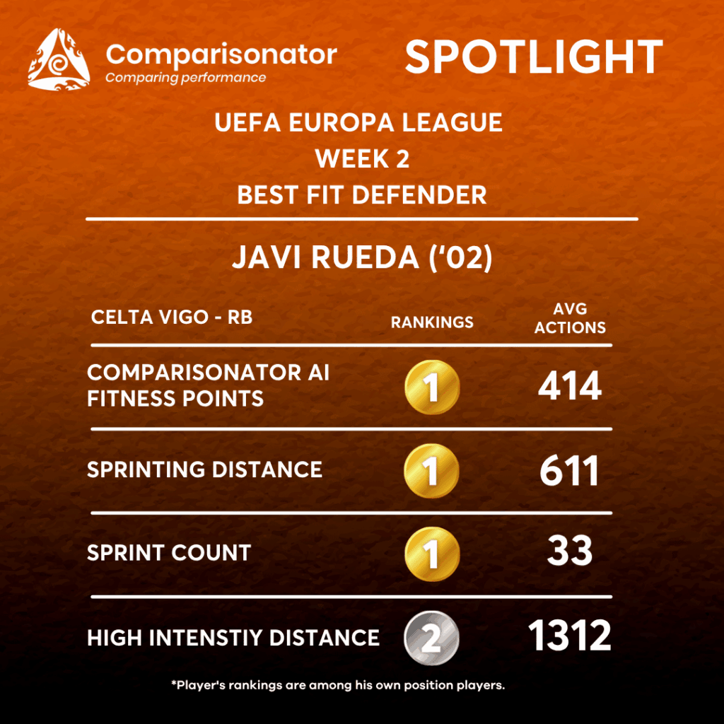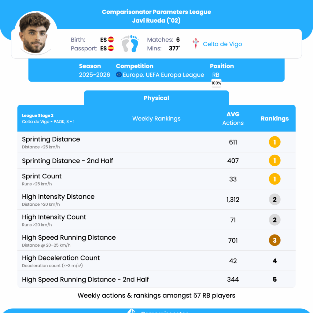 Javi Rueda’s strongest performance parameters in the selected matches highlight his sprinting distance, sprint count, and high-intensity distance, showcasing his physical dominance and tactical importance as a right-back. His top rankings in these areas underline his capacity to impact both defensive and offensive phases effectively. This ability to sustain high-intensity movements across the match duration can be pivotal for Celta de Vigo’s tactical setups, enhancing their ability to counter-press and transition quickly.