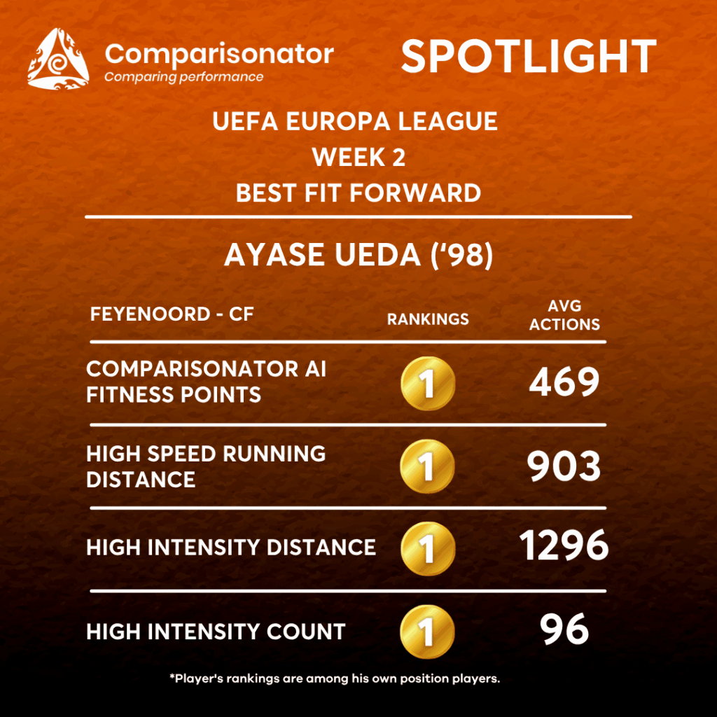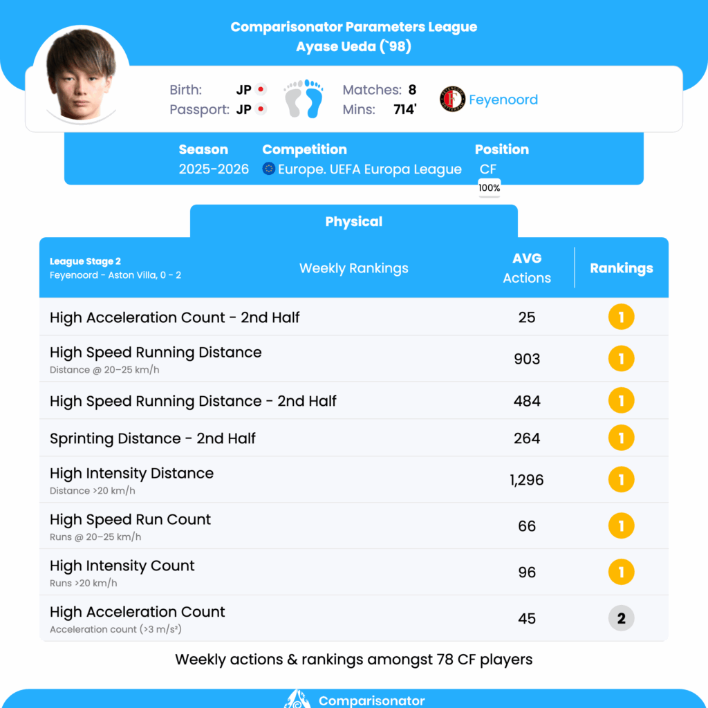Ayase Ueda’s performance in these selected matches highlights his exceptional physical capabilities, particularly in high acceleration and high-speed running metrics, where he consistently ranked first among center forwards. His ability to maintain high-intensity efforts throughout the match, especially in the second half, suggests significant tactical value for teams aiming to implement aggressive pressing strategies or exploit late-game counter-attacks. Ueda’s physical prowess provides Feyenoord with a dynamic presence upfront, capable of influencing match outcomes through relentless energy and movement.