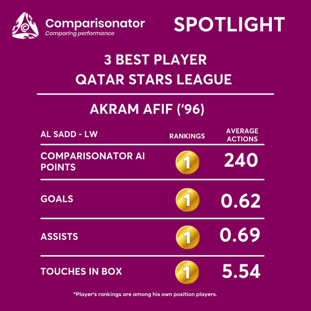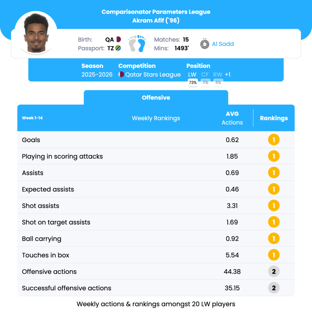 Akram Afif’s strongest rankings come in goals, assists, expected assists, shot creation, involvement in scoring attacks, touches in the box, and ball carrying, where he consistently ranks 1st among Left Wingers. These parameters collectively define him as a decisive final-third player with elite creative and finishing influence. His offensive profile points to a winger who not only initiates attacks but also consistently finishes and facilitates them, making him a central reference point in Al Sadd’s attacking structure during this period.