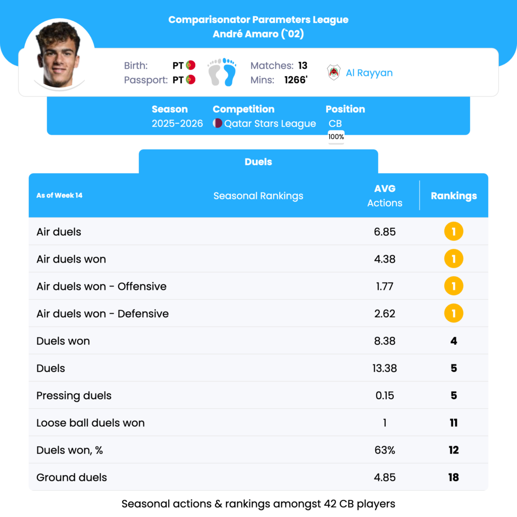André Amaro’s seasonal profile is clearly defined by elite aerial performance, where he ranks 1st among all CBs in multiple key categories: air duels, air duels won, and both offensive and defensive aerial wins. His overall duel volume and success also place him comfortably in the league’s upper tier. Conversely, his ground duel efficiency and involvement sit closer to the league average, which may limit his effectiveness in high-tempo, ground-heavy defensive systems.