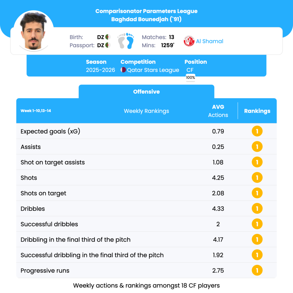 Bounedjah profiles as one of the most dominant offensive reference points in the league. His expected goals output of 0.79 per match, ranked 1st out of 18, places him clearly at the top of CFs in terms of chance quality and volume. This figure sits notably above the next closest performer, Róger Guedes at 0.65, indicating that Al Shamal’s attacking structure consistently funnels high-value chances toward him. Tactically, this suggests Bounedjah is not only finishing actions but also positioning himself in optimal scoring zones with high regularity. This is reinforced by his league-leading shots volume at 4.25 per match and shots on target at 2.08 per match, both ranked 1st among CFs. These numbers underline his role as the primary shooting outlet, capable of sustaining pressure on opposing defensive blocks. Combined with 6.25 touches in the box per match, also 1st in rank, Bounedjah shows elite box presence, operating as a constant threat between centre-backs and attacking second balls and rebounds. From a tactical perspective, this supports using him as a fixed penalty-area reference around whom second-line runners can operate.