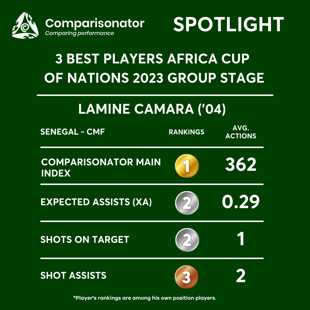 Senegal’s Lamine Camara has impressed as a central midfielder, boasting a Comparisonator Main Index of 362. While ranking second in expected goals (xA) with 0.29 per match and shots on target (1 per match), Camara’s dynamic presence in midfield has been crucial in Senegal’s build-up play and defensive stability.