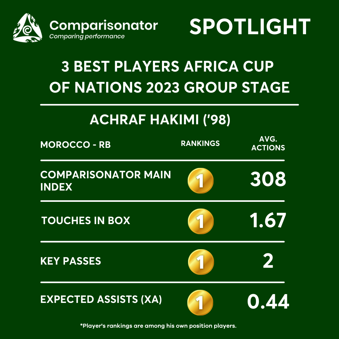 Morocco’s Achraf Hakimi has showcased his versatility and influence from the right-back position, leading with a Comparisonator Main Index of 308. With an average of 1.67 touches in the box per match and 2 key passes per match, Hakimi’s contributions extend beyond defensive duties, providing a significant attacking threat down the right flank for Morocco.